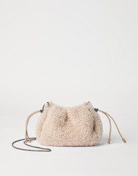 Refined materials and feminine embellishments come together in this Mellow mini bucket bag. Soft and full, the special texture of the fuzzy shearling emphasizes the design’s softness, gathered by a drawstring that acts as a closure. Four rows of precious monili create the shoulder strap, illuminating the accessory with radiant reflections in true Brunello Cucinelli style. MATERIALS The manufacturing of the soft wool lightens the tips to create a slightly uneven color that emphasizes the fleece’s wavy, full effect. DETAILS Drawstring closure Shoulder strap Leather lining 1 slot for cards and business cards All metal parts are Nickel-free Nickel-free monili decoration Bag is 26 cm long, 6,5 cm wide and 14 cm high 100% FUR