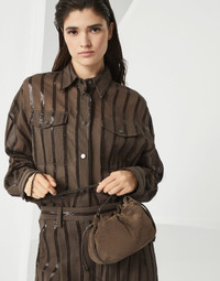 The velvety look of suede and feminine embellishments define the classic feel of this mini Bucket Mellow bag. The leather’s velvety hand perfectly complements the bag’s minimalist lines, which are gathered by the drawstring closure. Four rows of precious monili are joined together to create the shoulder strap, illuminating the accessory with radiant reflections in true Brunello Cucinelli style. MATERIALS The refined suede has an elegant, sophisticated appearance characterized by its unmistakable velvety, slightly uneven texture. DETAILS Drawstring closure Shoulder strap Suede lining 1 slot for cards and business cards All metal parts are Nickel-free Bag is 26 cm (10.24") long, 6.5 cm (2.56") wide, and 14 cm (5.51") high 100% REAL LEATHER