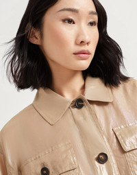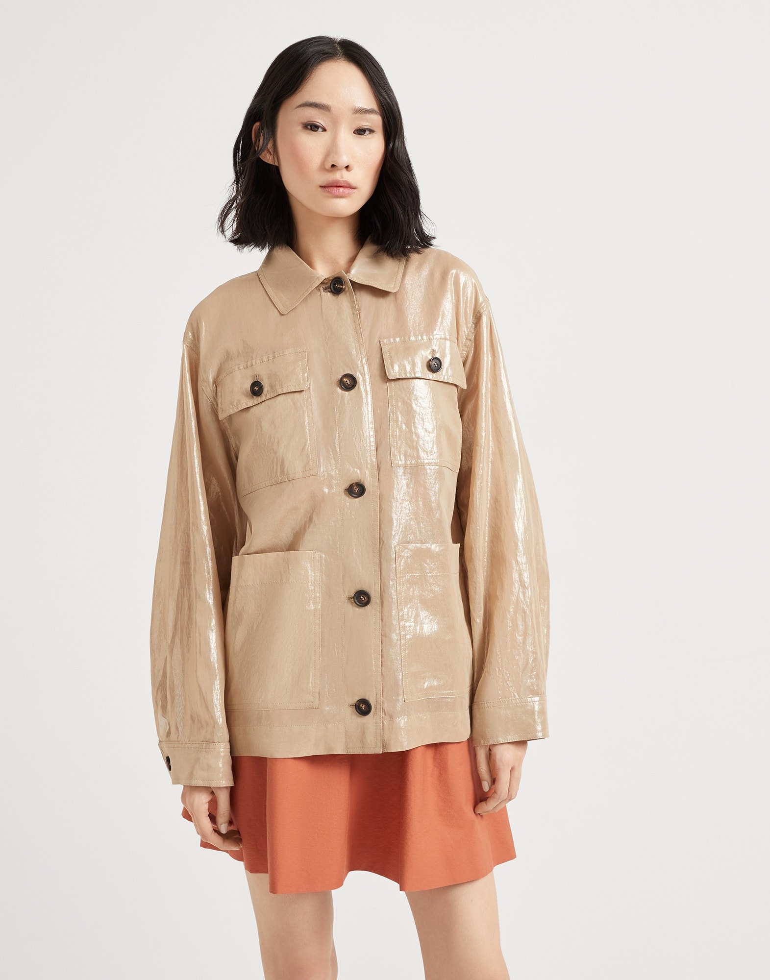 Refined materials and feminine embellishments enrich the timeless style of this cotton gauze outerwear jacket. The lame thread enhances the garment’s surface with an elegant mirrored effect, while the classic button closure and the chest pockets introduce functional elements. The iconic shiny monili embroidery completes the jacket with an additional sparkling note in true Brunello Cucinelli style. MATERIALS The new cotton gauze, with a light appearance, is enriched with a bright lame thread that creates a mirrored effect on the surface of the garment. DETAILS Horn button closure Shirt-style collar Upper pockets with flap and button Button cuffs Nickel-free monili decoration 100% COTTON