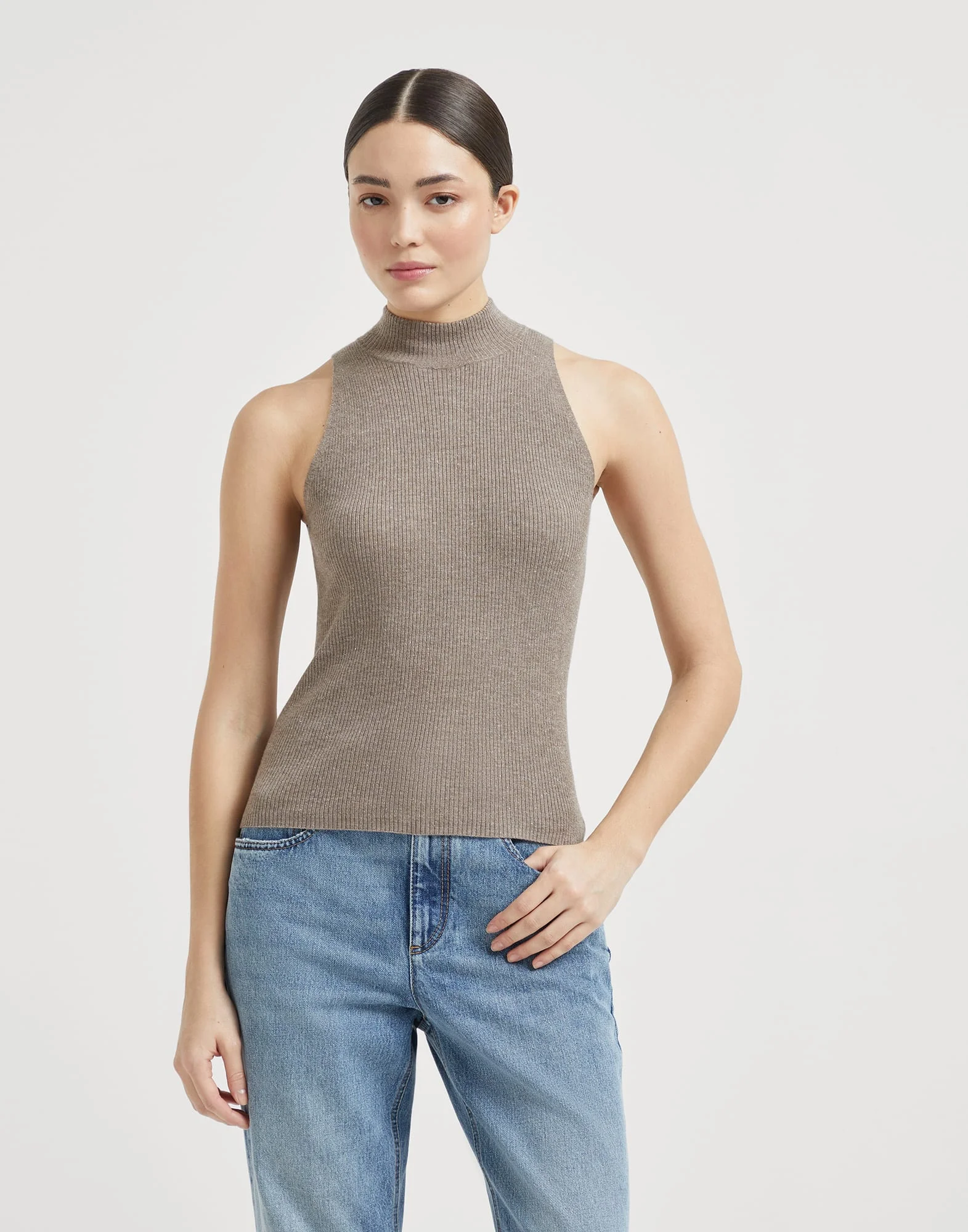The beauty of Brunello Cucinelli yarns enriches this top in knitted cashmere Sparkling yarn, an essential and sophisticated garment. The cropped design highlights the traditional rib knitting, which showcases the delicate reflections of the lame thread for a slightly shimmering effect. MATERIALS The soft and lightweight cashmere Sparkling yarn combines the natural fiber’s refined qualities with a lame thread that enriches the texture with delicate reflections. DETAILS Rib knit Cropped hem 46% CASHMERE, 41% VISCOSE, 13% POLYESTER