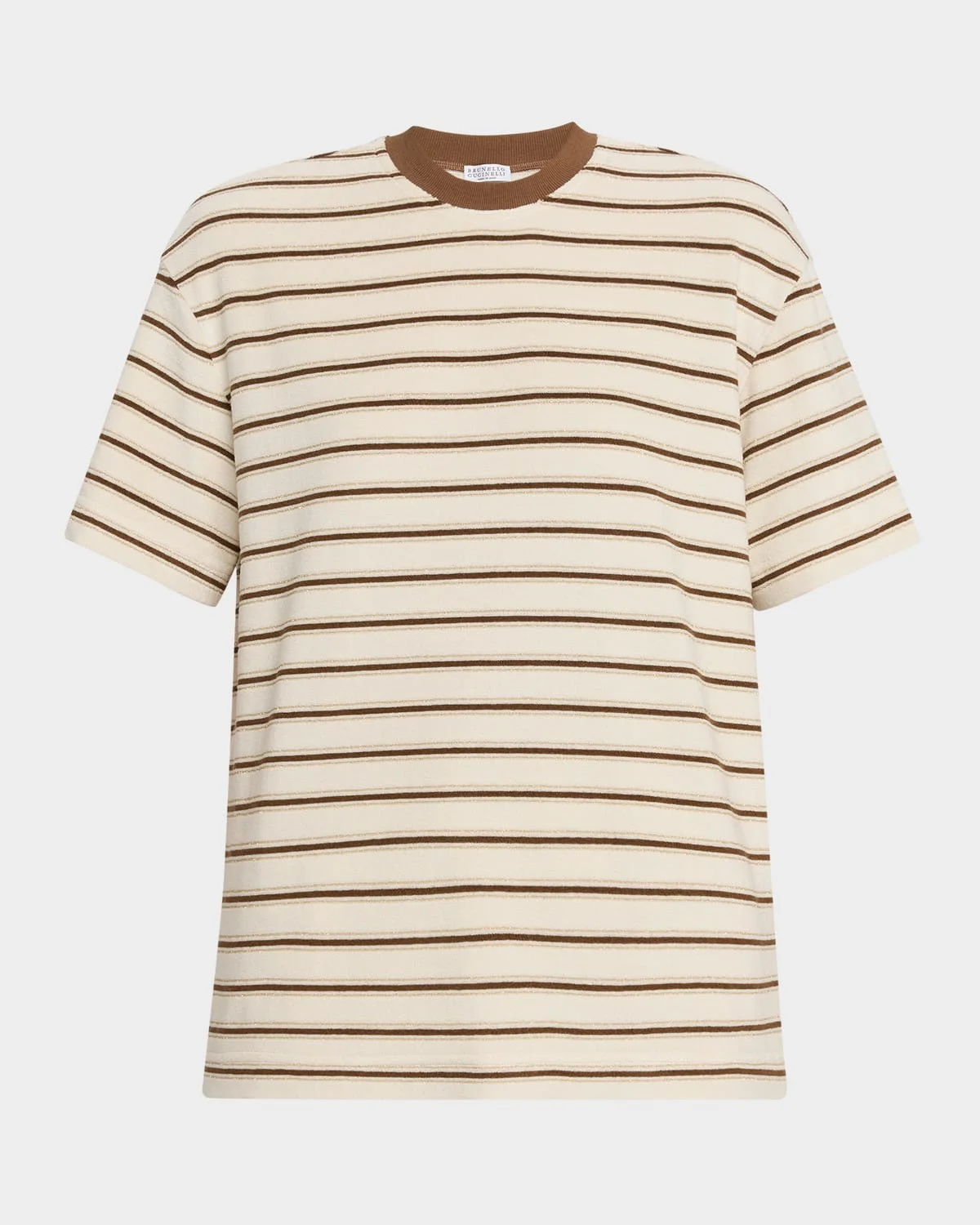 Brunello Cucinelli Tshirt is crafted of a metallic striped cottonblend towelling with a contrast collar Crew neckline Short sleeves Loose fit Pullover style Silk/cotton/nylon/polyamide Dry clean Made in Italy