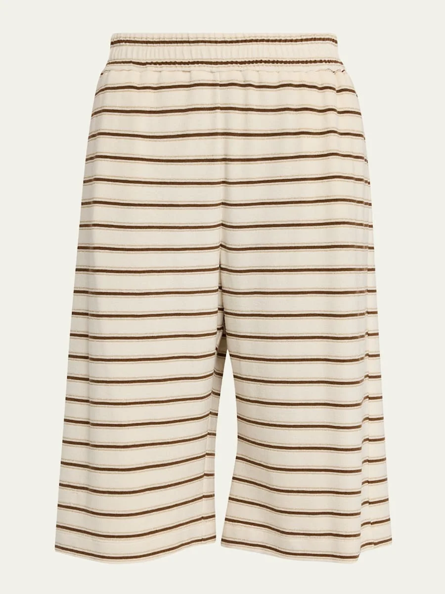 Brunello Cucinelli Bermuda shorts are crafted of a metallic striped towelling with an elastcized waistband Mid rise sits high on hip Side slip pockets Back patch pockets Straight legs Knee length Pull-on style Silk/cotton/acetate Dry clean Made in Italy Online Inquiries: BGS21_BB1HK| Store Inquiries: #5438560