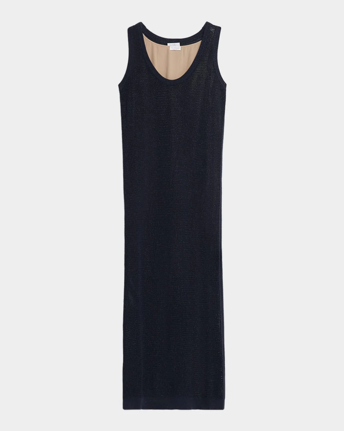 This tank dress from Brunello Cucinelli is crafted from metallic textured open knit Scoop neckline Sleeveless Sheath silhouette Ankle length Ribbed hem Pullover style Cotton/viscose/Lurex® metallic fibers Dry clean Made in Italy