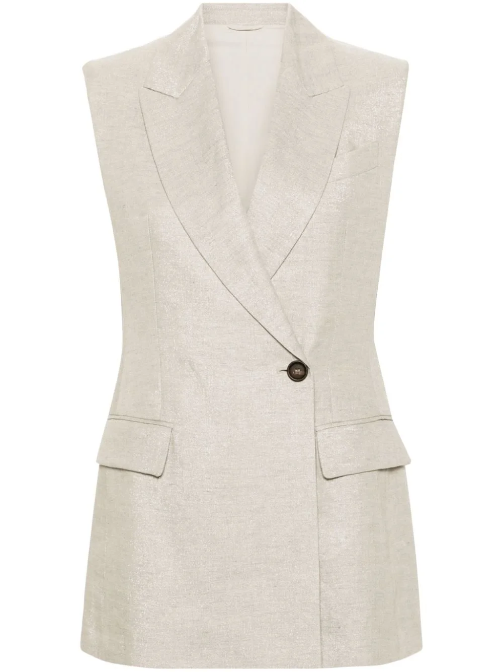 metallic-threading sleeveless blazer Highlights - Light grey - Linen blend - Metallic threading - Peak lapels - Off-centre front button fastening - Shoulder pads - Sleeveless - Chest welt pocket - Two side flap pockets - American rear vent - Straight hem - Full lining Made in Italy Composition Outer: Eco Brass 100%, Linen/Flax 95%, Polyester 3%, Polyamide 2% Lining: Acetate 74%, Silk 26% SIZE & FIT Model measurements Height 5 ft 11 in(1.8 m) Bust/Chest 34.25 in(87 cm) Hips 35.82 in(91 cm) Waist 24.8 in(63 cm) FittingInformation Designed for a slim fit that sits just away from the body offering a close yet comfortable fit The internal shoulder pads offer a structured shape Made from a midweight non-stretch fabric This piece fits true to size – take your usual size
