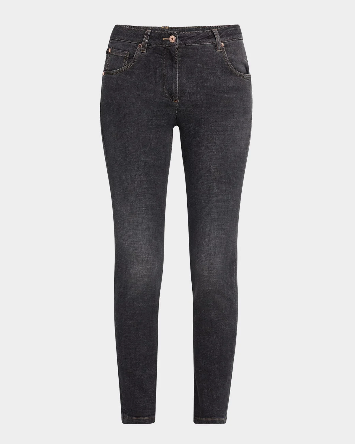 - Brunello Cucinelli jeans in gray wash denim with faded knees - Features a signature monili trimmed back belt loop - Mid rise sits high on hip - Five-pocket style - Slim legs - Ankle length - Button/zip fly; belt loops - Cotton - Made in Italy