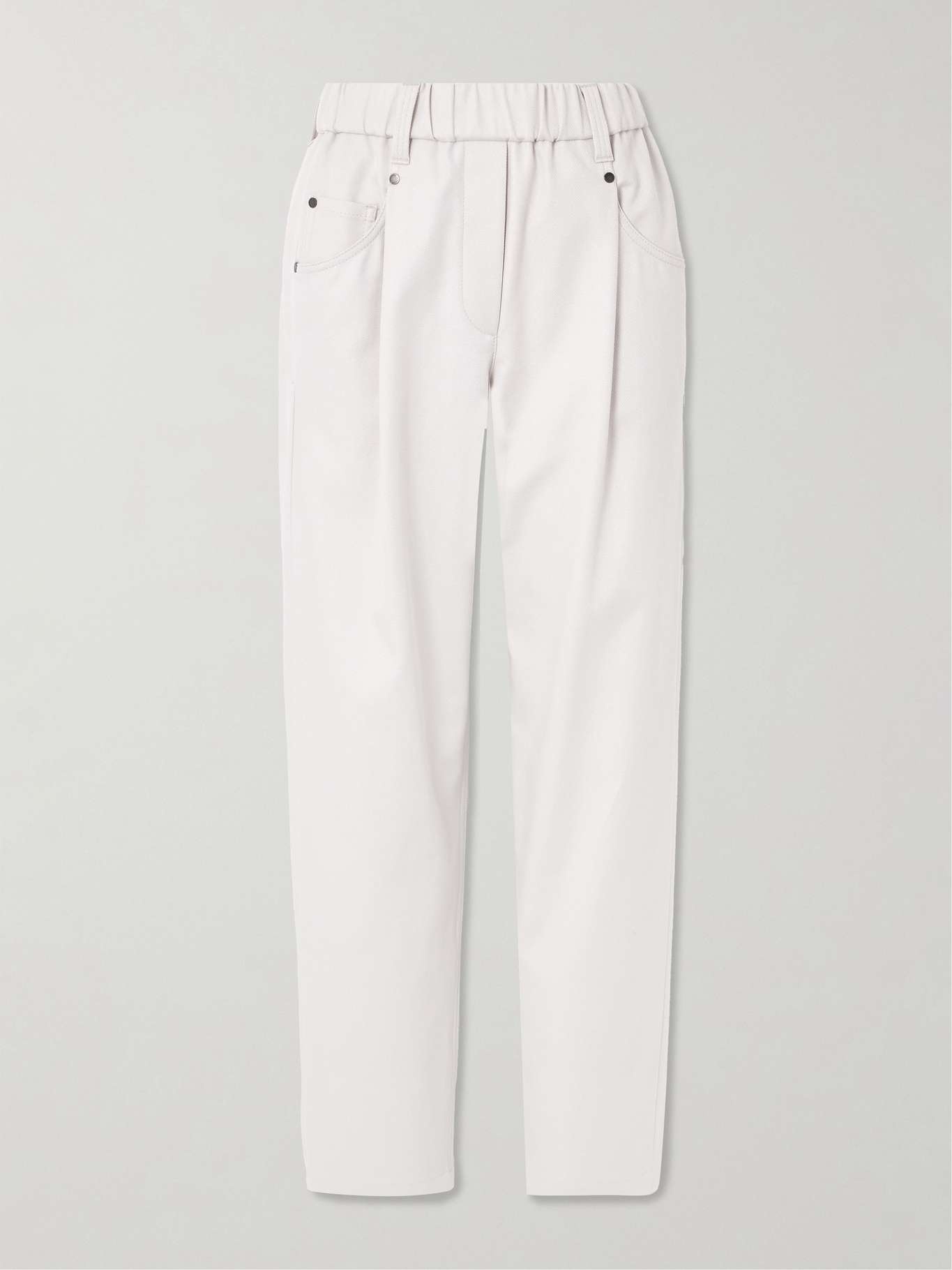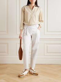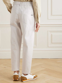 Brunello Cucinelli's pants channel the label's masterful relaxed tailoring. They're cut from cotton-blend twill and have lightly pressed creases along the tapered legs. You can even roll the cuffs if you wish. Size & Fit - Fits true to size, take your normal size - High-rise, intended for a relaxed fit, tapered at the hem - Elasticated at the waist for a flexible fit - Mid-weight, slightly stretchy fabric - Model is 177cm/ 5'10" and is wearing an IT 40 Model measurements: - Bust: 85cm/ 33” - Waist: 66cm/ 26” - Hip: 92cm/ 36” Details & Care - White cotton-blend twill - Pull on - 97% cotton, 3% elastane - Dry clean