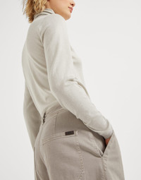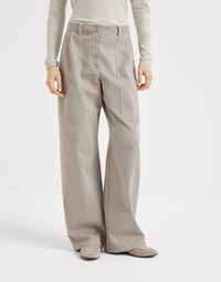 A casual attitude and precious details come together in perfect harmony in these Loose Utility trousers. The soft texture of dyed stretch denim perfectly complements the relaxed fit, highlighting the large front pockets, inspired by the world of utility wear. A shiny monili embroidery illuminates the garment with a feminine sparkle in true Brunello Cucinelli style. MATERIALS The stretch cotton denim is garment-dyed in the season’s delicate colors. A small percentage of spandex helps to make the fabric comfortable to wear. DETAILS Zip closure with metal hook and backing button Cargo pockets Back pockets Nickel-free monili decoration 96% COTTON, 4% ELASTANE