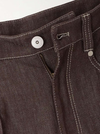 EDITORS'NOTES From the deep brown shade to the contrast topstitching, it's clear that Brunello Cucinelli's jeans take cues from vintage workwear. They're cut from rigid denim and have extra-long, wide legs pressed with sharp creases. Complement the high-rise waist with a slightly cropped tee. Large to size. See Size & Fit notes. SIZE & FIT Model measurements: - Fits large to size, take one size smaller than normal - High-rise, intended for a wide-leg fit - Mid-weight, non-stretchy denim - Size IT 38 jeans have an inside leg of 30"/ 77cm - Model is 177cm/ 5'10", normally wears an IT 40 and is wearing an IT 38 - Bust: 85cm/ 33.5" - Waist: 65cm/ 25.5" - Hip: 91cm/ 36" DETAILS & CARE - Brown denim - Button and concealed zip fastening at front - 100% cotton - Machine wash