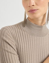 Refined materials enhance traditional workmanship in this new Sparkling cashmere and silk rib knit dress. The shiny reflections of the lame thread enrich the ribbed surface with a delicate feminine sparkle. The garment features three-quarter length sleeves and comfortable fitted lines that are slightly flared at the bottom. MATERIALS Cashmere and silk fibers are manufactured together with a fine lame thread to enrich the texture with delicate metallic reflections. The presence of a synthetic fiber provides added comfort. DETAILS Crew-neck Regular sleeve Rib knit 51% CASHMERE, 22% SILK, 20% NYLON, 7% POLYESTER