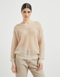 Casual inspiration is enriched with Brunello Cucinelli’s refined materials and sophisticated details in this new mohair, cotton and wool dazzling mesh sweater. Classic netting is reinterpreted in a precious way thanks to the presence of sequins that spread delicate sparkling reflections on the entire surface. The fit offers relaxed, comfortable proportions, completed by a V-neckline and rib knit edges. MATERIALS The lightness, comfort and softness of the mohair, cotton and wool fibers are paired with the dazzling mesh knitting that reinterprets netting in a precious way thanks to the small sequins embedded into the yarn. DETAILS V-neck Drop shoulder Wide sleeve Net knitting 42% MOHAIR, 30% NYLON, 12% COTTON, 11% WOOL, 5% POLYESTER