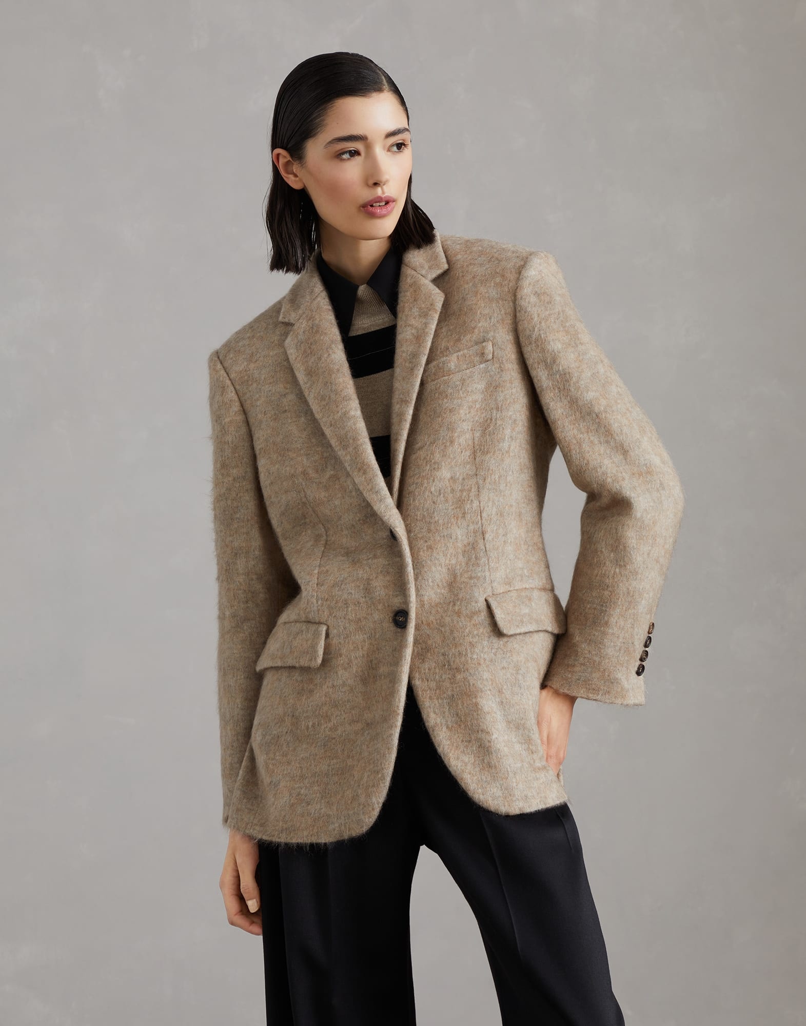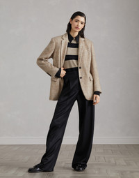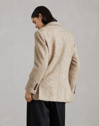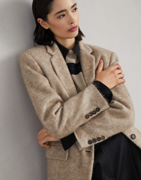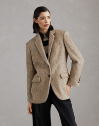 Retro inspiration and refined fabrics define the timeless style of this mohair, wool and cashmere knit blazer. The classic cut of the lapel perfectly complements the casual feel of the flap pockets. The fabric’s mottled appearance enhances the garment’s compact structure. The precious monili detail adds an elegant sparkle. MATERIALS The combination of refined natural fibers creates a high-quality fabric that is perfect for the cold. The softness of the yarns provides a pleasant sensation. The silk-blend lining adds an elegant finish and guarantees optimal comfort. DETAILS Horn button closure Notched lapel Acetate and silk satin lining Welt pockets with flap and chest pocket Cuffs have four horn buttons Double back vent Nickel-free monili decoration 28% MOHAIR, 26% VIRGIN WOOL, 20% NYLON, 13% CASHMERE, 8% WOOL