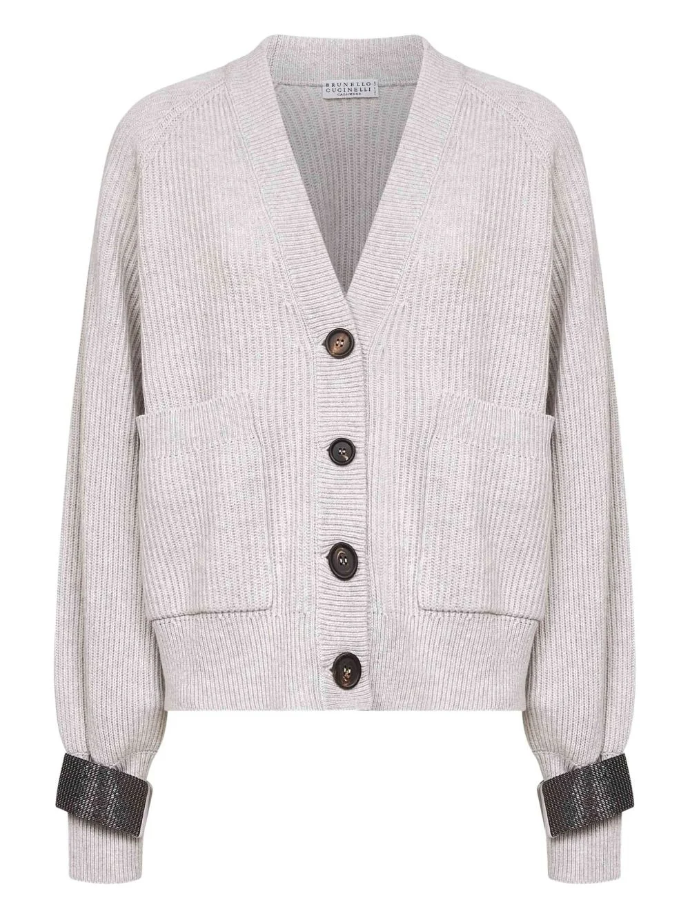 embroidered-cuff button cardigan Highlights - Grey - V-neck - Button placket - Patch pockets - Ribbed cuffs - Embroidered cuffs Made in Italy Composition Cashmere 100% Washing instructions Read Manufacturer Guidelines