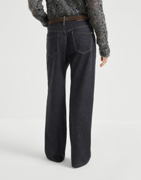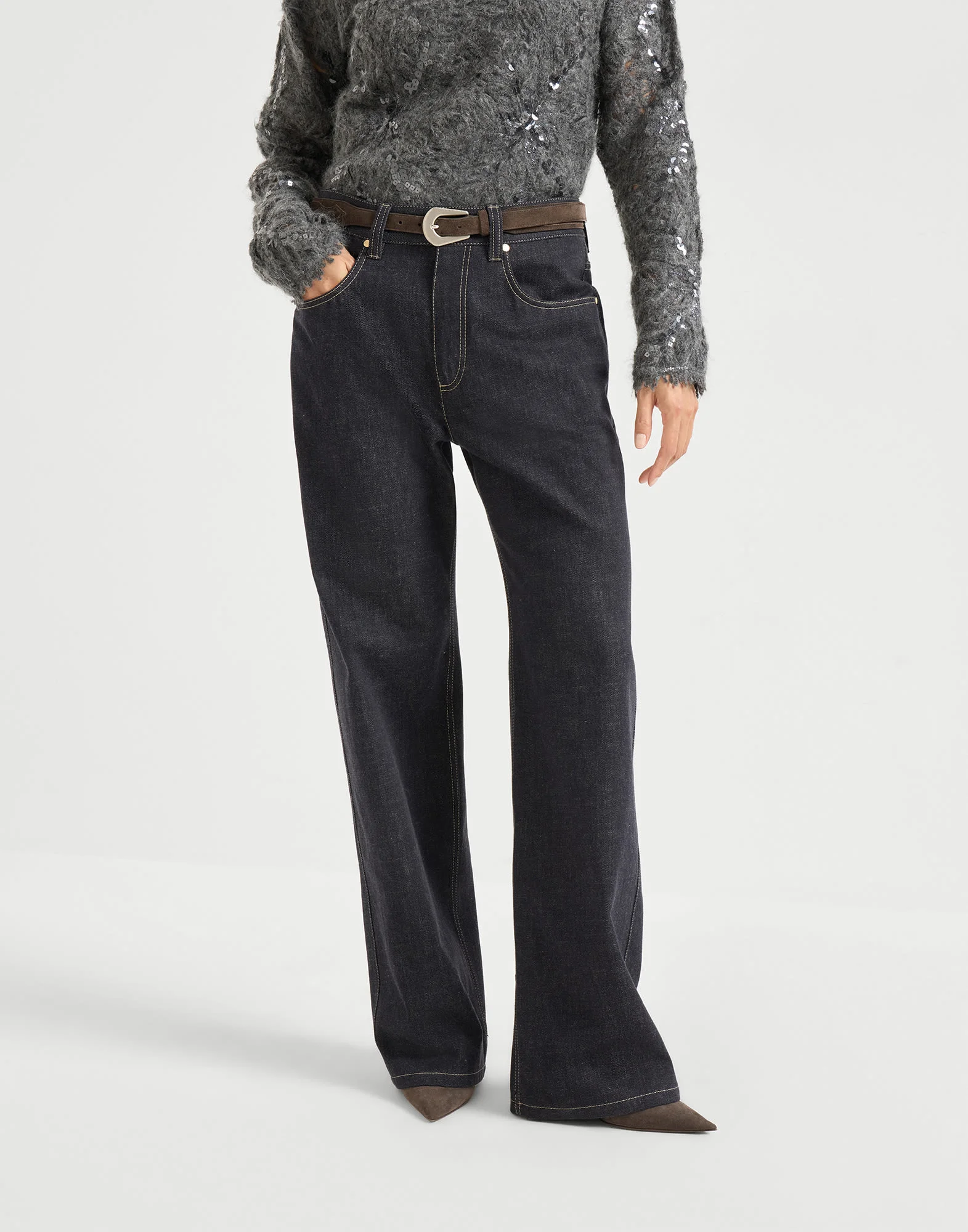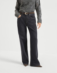 Casual proportions and precious details come together in perfect harmony in these contemporary loose trousers. The regular fit in the hips develops into a wide, comfortable leg, giving the garment a contemporary allure. The shiny monili embroidery adds a delicate touch of feminine sparkle in true Brunello Cucinelli style. MATERIALS The pure cotton denim is characterized by a lightweight texture and a dark color that does not lighten after washing. DETAILS Zip closure with button Front patch pockets with watch pocket Back patch pockets Nickel-free monili decoration 100% COTTON