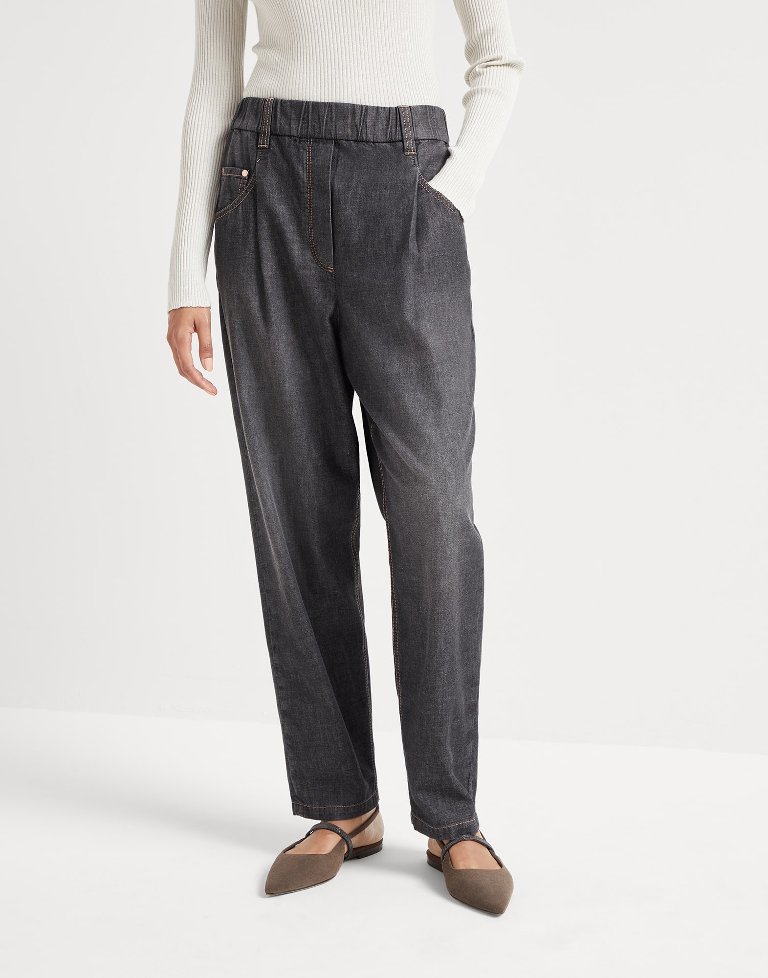A casual style meets refined details in the new five-pocket trousers. Lightweight, slightly worn-looking denim enhances the casual, summery feel of the garment, featuring a relaxed silhouette at the top that tightens at the bottom. An elasticated waistband provides comfort, MATERIALS Lightweight pure cotton denim uses combed threads that give the texture a light, compact and semi-glossy appearance. The dye on the fabric spreads the color with slight color shading which can evolve with regular use and washing, a luxurious trait that makes each style unique. DETAILS Pull-up trousers Elastic waistband Front pockets with watch pocket Back patch pockets 100% COTTON