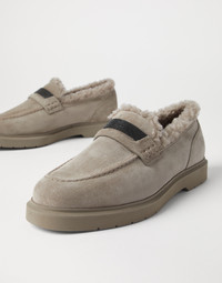 Refined materials and sparkling embellishments reinterpret the menswear inspiration of these Penny Loafers with a modern, elegant feel. The velvety texture of suede lends a refined note to the footwear, while the soft shearling lining adds a sophisticated styling detail and ensures warmth and comfort. The welt is enriched with a sparkling strap embroidered in shiny monili, the iconic embellishment of the Brunello Cucinelli collections. MATERIALS The light, velvety texture of suede is combined with a shiny monili detail. A shearling lining and a rubber outsole provide added comfort. DETAILS Shearling lining Sole in lightweight micro rubber TPU rubber tread Nickel-free monili decoration REAL LEATHER