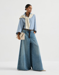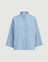 Refined embellishments enrich the masculine striped pattern of this cotton poplin shirt. The garment features slightly cropped proportions with generous three-quarter sleeves, creating a very feminine silhouette. The classic stripe is reimagined with a "shadow" effect that provides the surface with a touch of depth and a sense of movement. A precious monili embroidery completes the design with an iconic sparkling note in true Brunello Cucinelli style. MATERIALS Pure cotton poplin, characteristic of year-round shirting, is a compact and even fabric with a lightweight, cool hand. DETAILS Mother of pearl button closure Classic collar Drop shoulder Cuffs have one mother of pearl button Wide sleeve Nickel-free monili decoration 100% COTTON