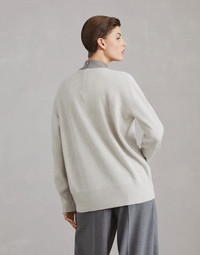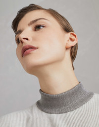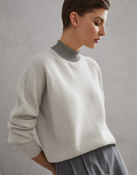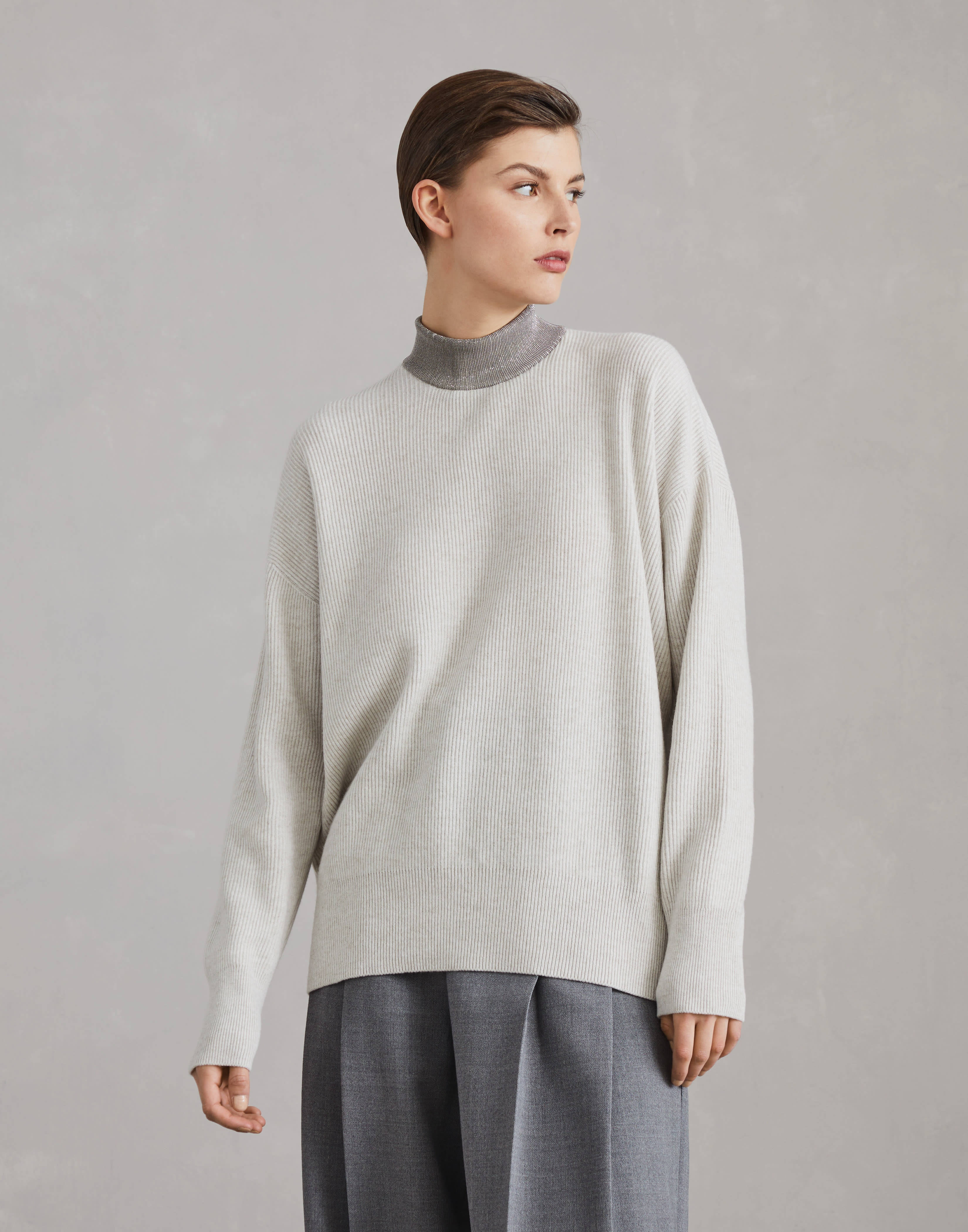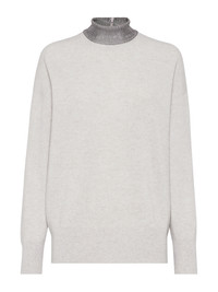This timeless cashmere sweater combines the beauty of knitwear, endless comfort and elegant details. Inspired by rib knitting, a precious shiny monili embroidery stands out on the collar, adding a delicate sparkle in true Brunello Cucinelli style. MATERIALS The noble cashmere fiber is characterized by an extreme fineness and also for its precious insulating qualities which guarantee warmth, providing coverage and lightness when worn. DETAILS High collar Drop shoulder English rib Nickel-free monili decoration 100% CASHMERE