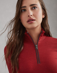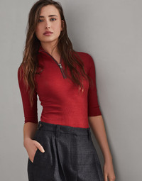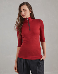 A sporty style and distinctly feminine details come together perfectly in this wool jersey mock neck T-shirt. The timeless, slightly three-dimensional ribbing follows the fitted lines of the silhouette, characterized by regular shoulders and elbow-length sleeves. The zipper closure highlights the garment’s casual nature and is enriched with a precious embroidery of fine rows of shiny monili for a delicate sparkle. MATERIALS Wool jersey is a warn, lightweight fabric, enriched with a small percentage of synthetic fiber to provide added comfort. DETAILS Zip opening High collar Regular shoulder Regular sleeve Nickel-free monili decoration 100% WOOL