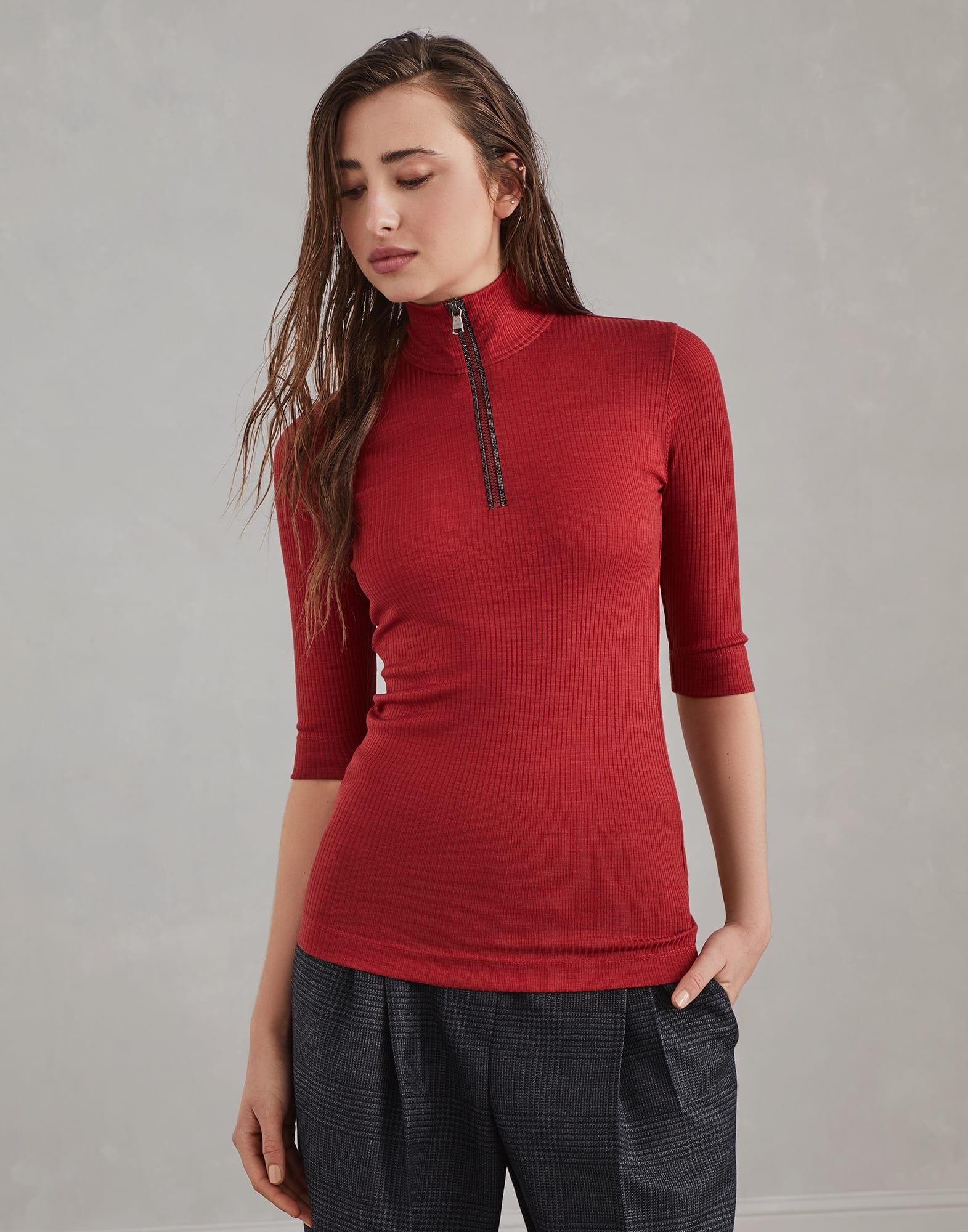 Ribbed wool jersey turtleneck t-shirt with precious half zip