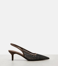 These pumps from Brunello Cucinelli boast a timeless slingback silhouette with a signature touch. Designed with a suede lining, the pair features 55mm kitten heels and all-over Monili beading on the intricate uppers. Product Details - Upper: fabric - Lining: fabric - Sole: leather insole, leather and rubber sole - Toe shape: pointed toe - Made in Italy - Includes: shoe box, dust bag - Designer color name: Peat - Item color: brown - Trim: goat leather (suede) - Slingback strap - Item number: P01140259 Size & Fit - True to size - European sizes - 5,5cm-2" heel