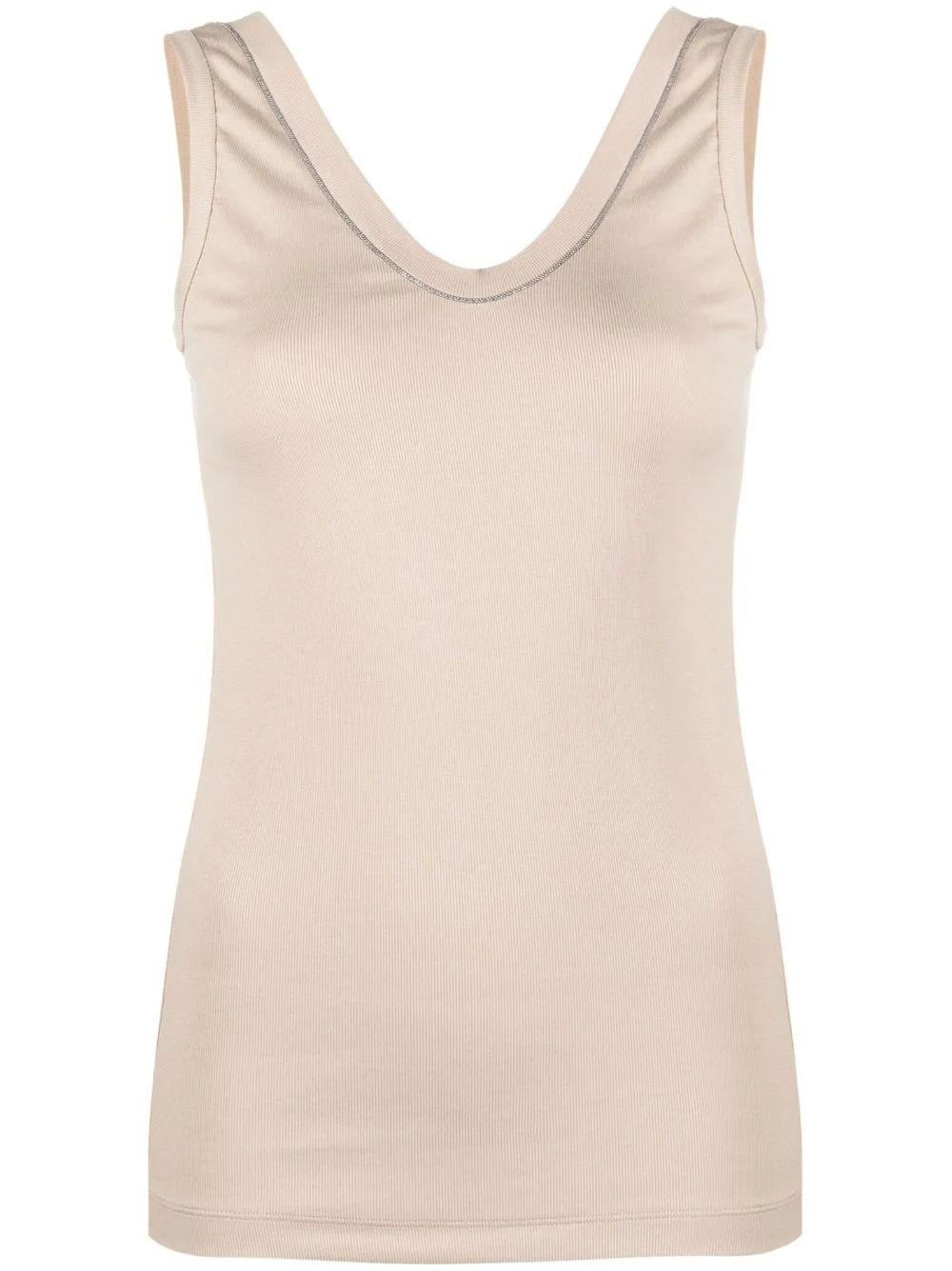 Monili bead-embellished ribbed-knit tank top Brunello Cucinelli adds a signature touch to this staple ribbed-knit tank top, tracing the scoop neck and pack with hallmark Monili beads for a touch of shimmer. Highlights - Light beige - Stretch-cotton - Fine ribbed - Scoop neck - Scoop back - Signature monili chain detail - Sleeveless - Straight hem Made in Italy Composition Cotton 100% SIZE & FIT Model measurements Height 5 ft 9 in(1.75 m) Bust/Chest 31.88 in(81 cm) Hips 33.85 in(86 cm) Waist 24.01 in(61 cm) FittingInformation Designed for a close fit throughout Made with a lightweight knit, this piece offers some stretch This piece fits close in all sizes – take your usual size