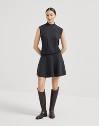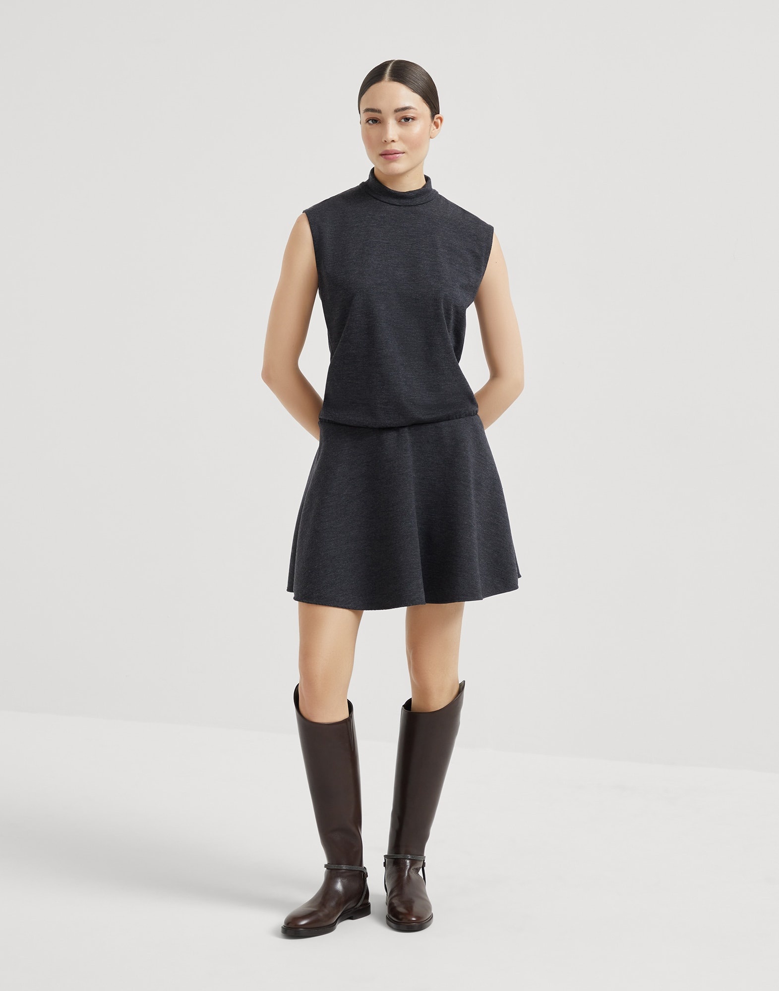 The lightweight, fluid effect of stretch virgin wool jersey pairs perfectly with the silhouette of this new mini dress. The top showcases fitted lines, a high neck and slightly exposed shoulders, while the skirt features semi-flared proportions at the bottom. The iconic embroidery of fine rows of monili completes the dress with a precious touch in true Brunello Cucinelli style. MATERIALS The virgin wool jersey is a warm and lightweight fabric, embellished with a small percentage of synthetic fiber to make it even more comfortable to wear. DETAILS High collar Zip opening at back of neck Elastic waistband Nickel-free monili decoration 94% VIRGIN WOOL, 6% ELASTANE