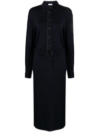 Monili chain-embellished shirt dress Brunello Cucinelli continues to embrace its signature Monili chain as a recurrent embellishment. Here, the subtle motif trims the front button fastening. Highlights - Navy blue - Virgin wool blend - Signature monili chain detail - Straight-point collar - Front button fastening - Long sleeves - Buttoned cuffs - Belt loops - Belted waist - Two side slit pockets - Central rear vent - Straight hem - Mid-length Made in Italy Composition Virgin Wool 94%, Elastane 6% SIZE & FIT Model measurements Height 5 ft 11 in(1.8 m) Bust/Chest 31.49 in(80 cm) Hips 36.61 in(93 cm) Waist 24.4 in(62 cm) FittingInformation Designed for a slim fit that sits just away from the body offering a close yet comfortable fit The vented hem offers movement at the rear Made from a midweight stretch fabric, this piece offers elasticity and flexibility when worn This piece fits true to size – take your usual size Washing instructions Dry Clean Only
