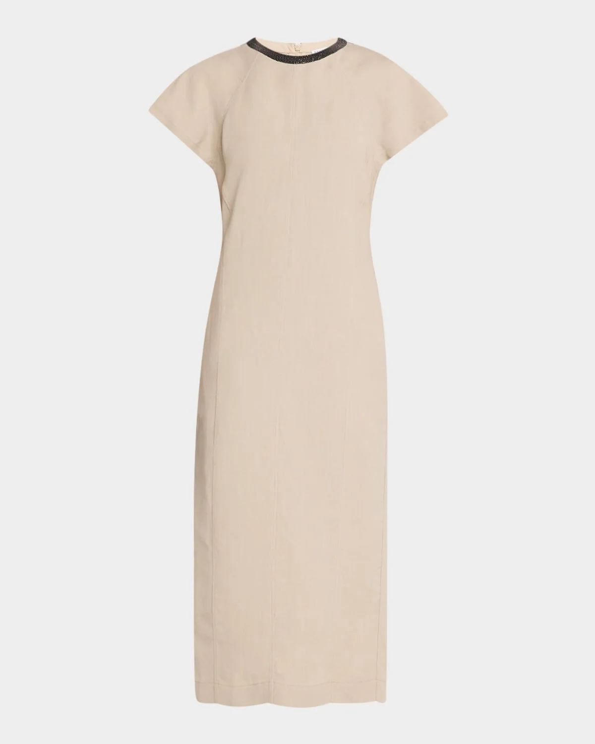 Brunello Cucinelli dress with a monili collar Jewel neckline Short sleeves Side slip pockets Midi length Sheath silhouette Back walking vent Slipover style Viscose/linen Made in Italy