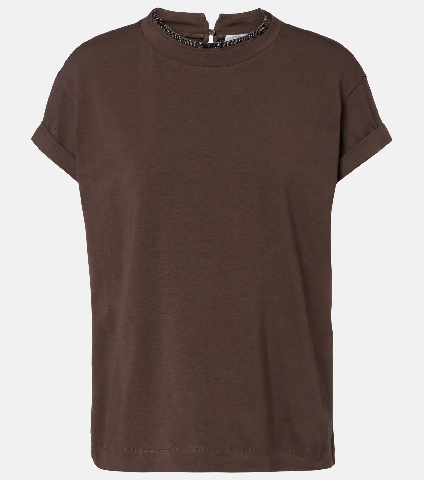 Brunello Cucinelli's designs are created in Solomeo, a medieval hamlet whose art and traditions are woven into the house's every fiber. This T-shirt is crafted from a soft cotton blend with signature Monili bead embellishments around the crewneck. Product Details - Material: 93% cotton, 7% elastane - Care instructions: hand wash - Made in Italy - Color: brown - Designer color name: Dark Brown - Trim: 100% brass - Contains non-textile parts of animal origin - Item number: P01143650 Size & Fit - True to size - Straight fit - Stretchy fabric - Falls to the hip - The model seen in the picture is 178cm-5'10" and wearing a size XS