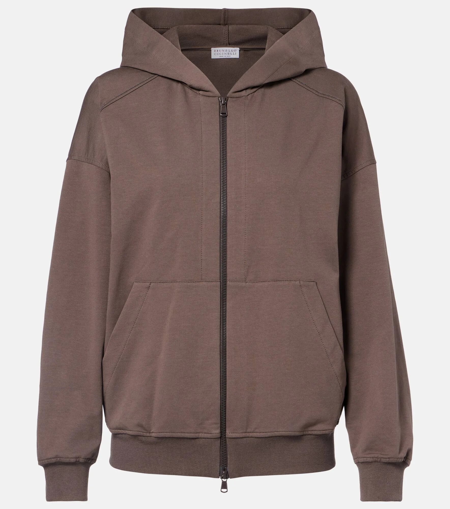Brunello Cucinelli's designs are created in Solomeo, a medieval hamlet whose art and traditions are woven into the house's every fiber. This cotton hoodie features a zip-up front and shimmering Monili beading. Product Details - Material: 98% cotton, 2% elastane - Care instructions: dry clean - Made in Italy - Designer color name: Dark Brown - Item color: brown - Details: 100% brass - Material II: 94% cotton, 6% elastane - Item number: P01143642 Size & Fit - True to size - Dropped shoulders - Designed for a loose fit - Elasticated hem - Slightly stretchy fabric - Falls to the hip - The model seen in the picture is 178cm-5'10" and wearing a size XS