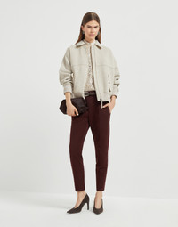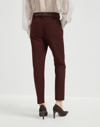 Timeless proportions and shimmering details define the iconic style of these stretch cotton cover cigarette trousers. The classic straight silhouette features an extremely feminine “cropped” edge and is highlighted by a pressed crease that flows down the full length, lending an impeccable look to the design. A precious monili embroidery, the iconic embellishment of the Brunello Cucinelli collections, adds an unexpected sparkling note. MATERIALS Cover is a twill fabric characterized by a slightly pronounced diagonal texture. The sporty feel of the fabric is balanced by the yarn dyeing, which disperses the colors of the season with an intense and sophisticated look. A very small percentage of spandex provides added comfort. DETAILS Zip closure with button and backing button Front pockets Back welt pockets Nickel-free monili decoration 97% COTTON, 3% ELASTANE