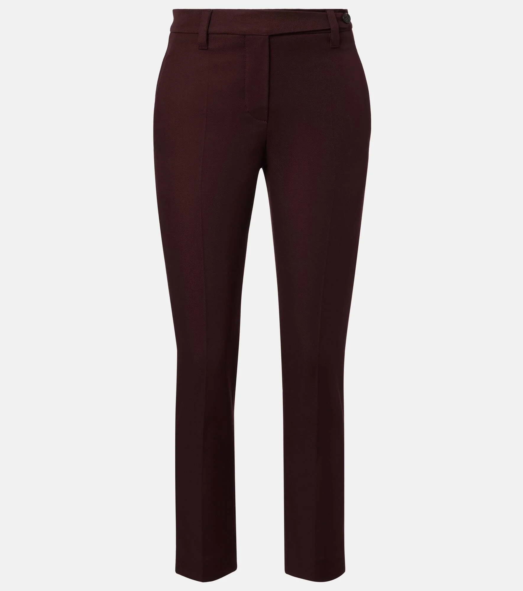 Brunello Cucinelli's designs are created in Solomeo, a medieval hamlet whose art and traditions are woven into the house's every fiber. Made from a cotton blend, these slim pants are complete with front pleats and Monili detailing at the back of the waist. Product Details - Material: 97% cotton, 3% elastane - Care instructions: dry clean - Made in Italy - Designer color name: Bordeaux - Item color: burgundy - Lining: 36% polyester, 32% acetate, 32% cupro - Contains non-textile parts of animal origin - Closure: zipper fly, button fastening - Pockets: slant pockets, welt pockets - Item number: P01054255 Size & Fit - True to size - Tight fit at thighs - Non-stretchy fabric - Slim-leg - The model seen in the picture is 178cm-5'10" and wearing a size IT 40