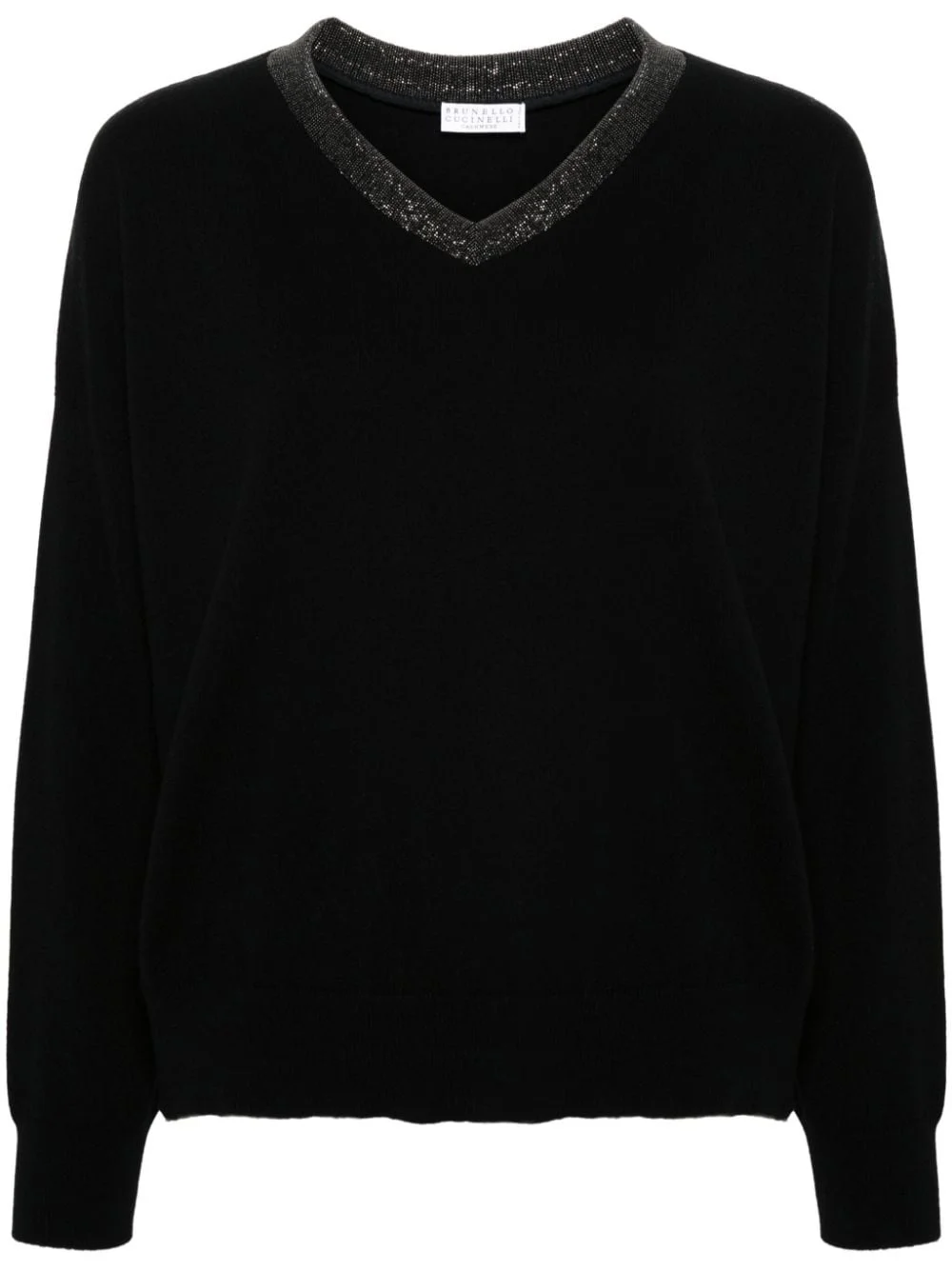 Monili-detail cashmere jumper Highlights - Black - Cashmere - Knitted construction - Signature monili chain detail - V-neck - Long sleeves - Ribbed cuffs and hem - Straight hem Made in Italy Composition Cashmere 100%, Cotton 93%, Elastane 7% SIZE & FIT Model measurements Height 5 ft 10 in(1.77 m) Bust/Chest 32.28 in(82 cm) Hips 35.03 in(89 cm) Waist 25.19 in(64 cm) FittingInformation Designed to be unstructured, offering a loose fit throughout Made with a midweight knit, this piece offers some stretch This piece fits true to size – take your usual size Washing instructions Hand Wash