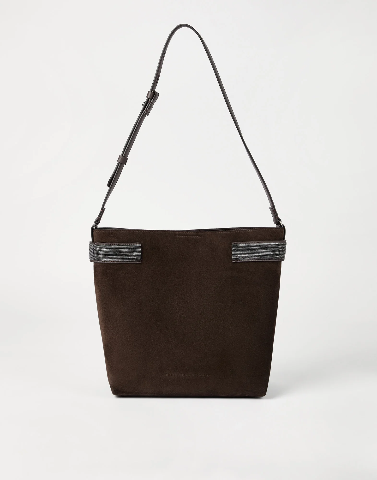 The classic bucket shape is reinterpreted in a Brunello Cucinelli way, bringing to life this essence bucket bag. The velvety texture of suede enlivens the season's color, while two precious monili embroidered inserts illuminate the bag's essential shape, hugging the sides with a delicate shimmering effect. The adjustable shoulder strap completes the style of the accessory with a functional detail. MATERIALS The refined suede is a compact leather with a soft, velvety texture. A leather lining completes the look of the bag. DETAILS Magnetic snap closure Adjustable and detachable shoulder strap Leather lining Internal pocket with zip closure Detachable internal pochette with zipper Nickel-free monili decoration The bag is 19 cm (7.48") long, 9 cm (3.54") wide, and 17 cm (6.69") high REAL LEATHER