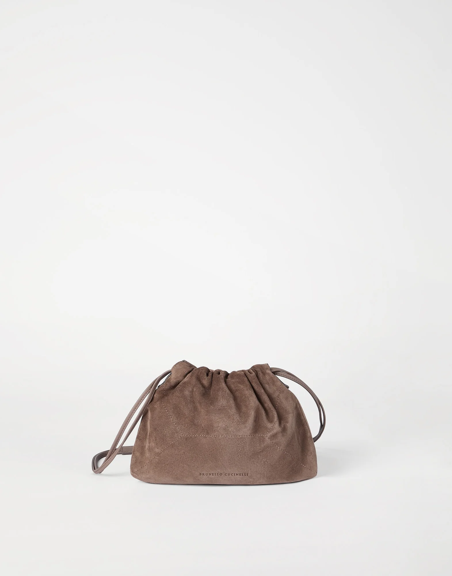 An essential aesthetic and precious details define the style of this suede BC Duo pouch bag. The velvety touch of the refined leather complements the design’s soft volume, gathered by a practical drawstring that serves as a closure. The use of monili provides an elegant sparkle in true Brunello Cucinelli style. MATERIALS The refined suede is a compact leather with a soft, velvety texture. A leather lining completes the look of the bag. DETAILS Drawstring closure Shoulder strap Leather lining Internal pocket Nickel-free monili decoration The bag is approximately 25 cm (9.84") long, 20 cm (7.87") wide, and 2 cm (0.79") high REAL LEATHER