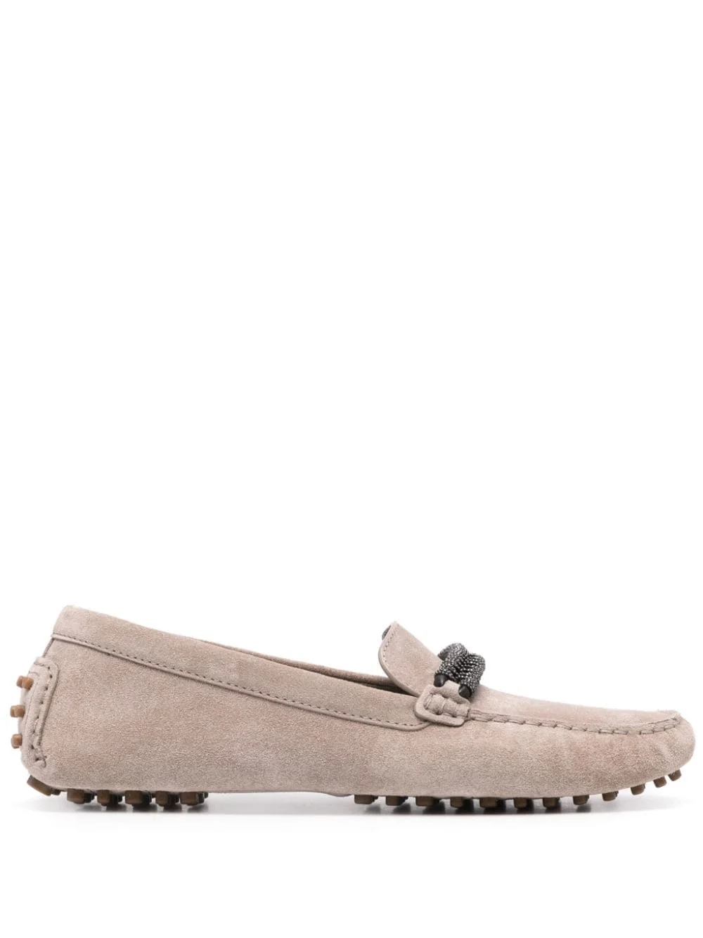 Monili-strap suede loafers Highlights - Taupe - Calf suede - Signature monili chain strap detail - Slip-on style - Round toe - Leather lining - Branded leather insole - Studded rubber sole - This piece comes complete with a protective dust bag. Made in Italy Composition Suede 100%