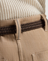 Relaxed style and refined details define the contemporary allure of these denim-effect twill wide smart trousers. The double pleats in the front add a tailored touch to the garment, characterized by soft lines that develop generously down the leg to define a nice and comfortable fit. The shiny monili embroidery adds a delicate touch of feminine sparkle in true Brunello Cucinelli style. MATERIALS Characterized by a look reminiscent of classic denim, the pure cotton twill is a lightweight, comfortable fabric, suitable for wearing during the warmer months. DETAILS Zip closure with metal hook and backing button Slanted front pockets Double pleat Back patch pockets Plain hem Nickel-free monili decoration 100% COTTON