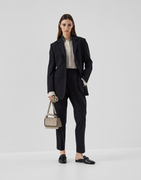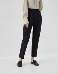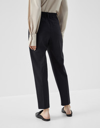 Baggy lines are paired with a cigarette silhouette in these new Tropical Luxury wool Baggy Cigarette trousers. The soft elasticized waist is combined with a tapered leg, while a pleat runs gently along the entire length. A shiny monili embroidery illuminates the belt loops with a delicate sparkling note in true Brunello Cucinelli style. MATERIALS The lightweight fabric combines the virgin wool natural fiber with a percentage of synthetic to provide added comfort. DETAILS Pull-up trousers Front patch pockets Back welt pockets Pleat Half-lined Nickel-free monili decoration 75% VIRGIN WOOL, 23% NYLON, 2% ELASTANE