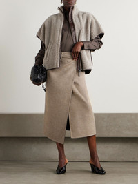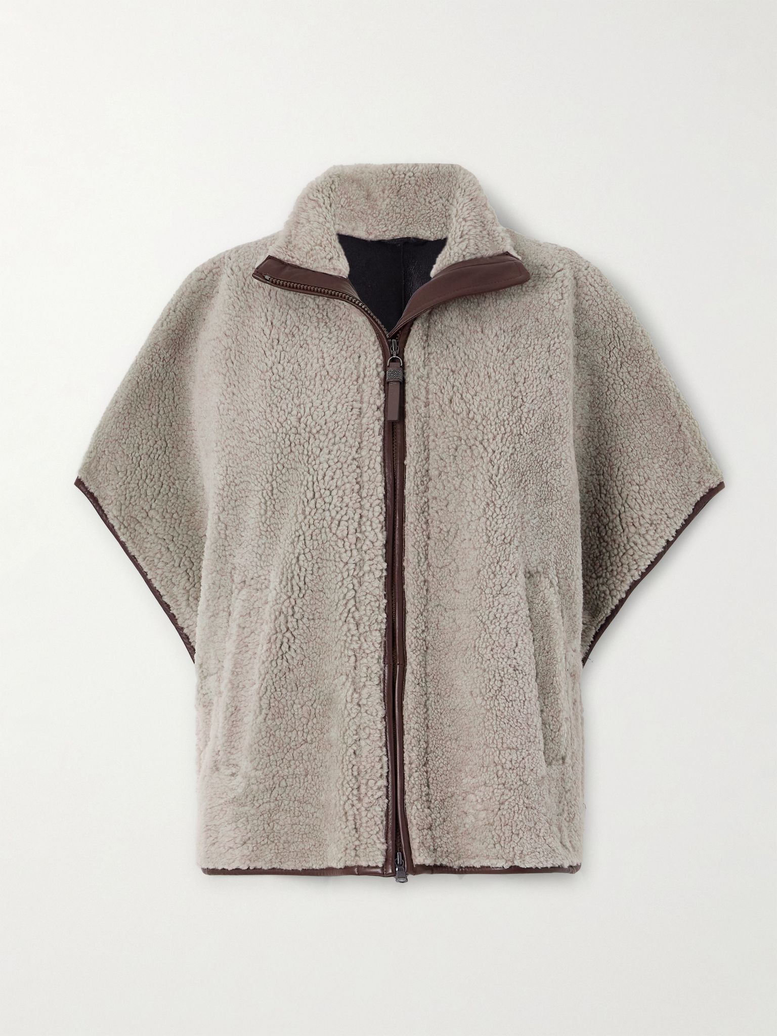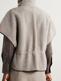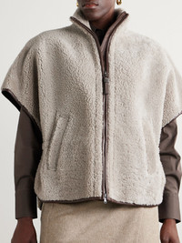 Brunello Cucinelli's vest is a chic way to add a layer of warmth to your outfit. It's made from fluffy shearling and has contrasting leather trims. The signature Monili beads add subtle sparkle, while the internal drawstring gently cinches the loose shape. Size & Fit - Fits true to size, take your normal size - Designed for a loose fit, use the adjustable drawcord to cinch in at the waist - Supple, structured, non-stretchy shearling - Model is 177cm/ 5'10" and is wearing an IT 40 Model measurements: - Bust: 80cm/ 31.5" - Waist: 60cm/ 23.5" - Hip: 89cm/ 35" Details & Care - Mushroom shearling, brown leather - Two-way zip fastening through front - 100% shearling (Lamb); trim: 100% leather (Lamb) - Unlined - Dry clean