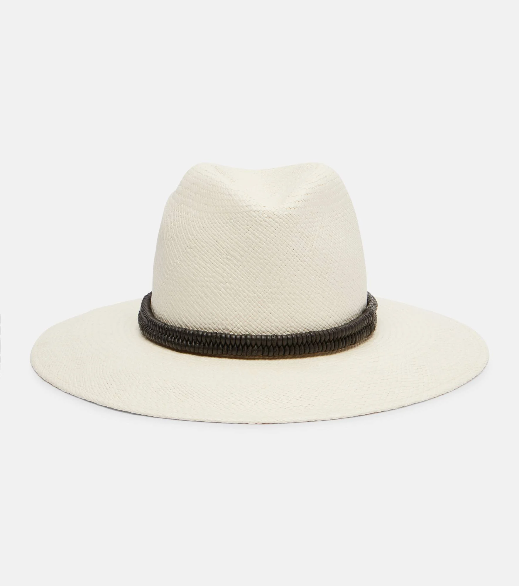 This fedora from Brunello Cucinelli is a must-have for your next getaway. Made from straw with a wide brim, the piece features the brand's signature Monili beads and leather trims. Product Details - Material: 100% straw - Care instructions: do not wash - Made in Italy - Designer color name: Bianco+Ultrablack - Item color: white - Trim: 60% cotton, 40% acetate - Details: 100% brass - Insert: 100% leather - Contains non-textile parts of animal origin - Item number: P01037893 Size & Fit - Circumference size M 56cm-22" - Width of brim 9cm-3.5"