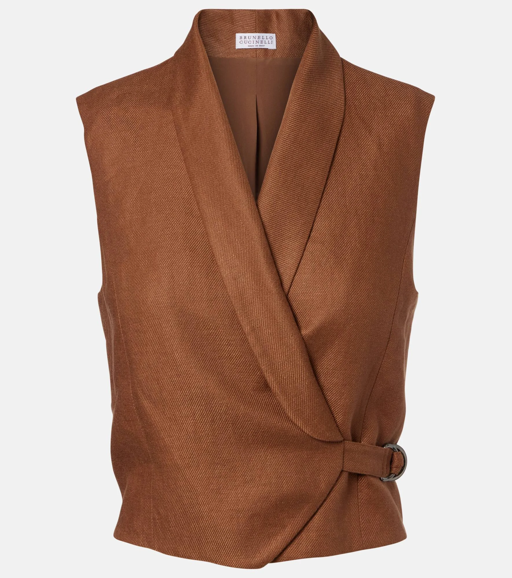 This vest from Brunello Cucinelli is tailored from linen to a slightly cropped silhouette. The design stands out with diagonal shawl lapels, complemented by a buckled side strap and fine Monili beading below the collar. Product Details - Material: 100% linen - Care instructions: dry clean - Made in Italy - Color: brown - Designer color name: Mou - Details: 100% brass - Material II: 74% acetate, 26% silk - Closure: belted waist - Item number: P01143544 Size & Fit - True to size - Cinched waist - Elasticated hem - Non-stretchy fabric - Slightly cropped - The model seen in the picture is 178cm-5'10" and wearing a size IT 40