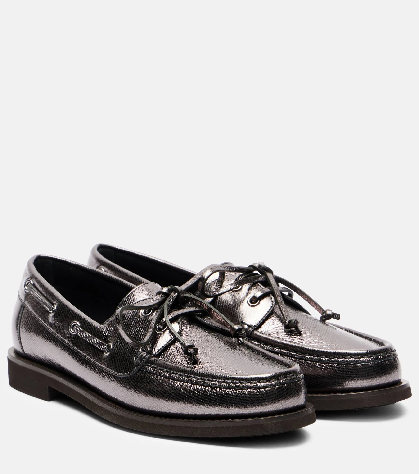 A Brunello Cucinelli signature, monili beading is made from nickel-free brass that's faceted to create a sparkling effect and hand-applied to each item. On these metallic leather boat shoes, the embellishment is featured on the traditional laces that adorn the sides. Product Details - Upper: leather - Lining: leather - Sole: leather insole, rubber sole - Toe shape: almond toe - Made in Italy - Includes: shoe box, dust bag - Designer color name: Antracite - Item color: silver - Item number: P01058333 Size & Fit - True to size - European sizes - 2cm-1" heel (size EU 38) - 1,5cm-0.5" platform (size EU 38)