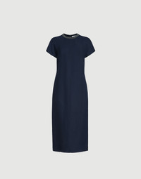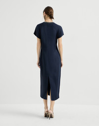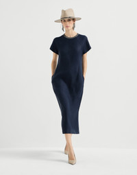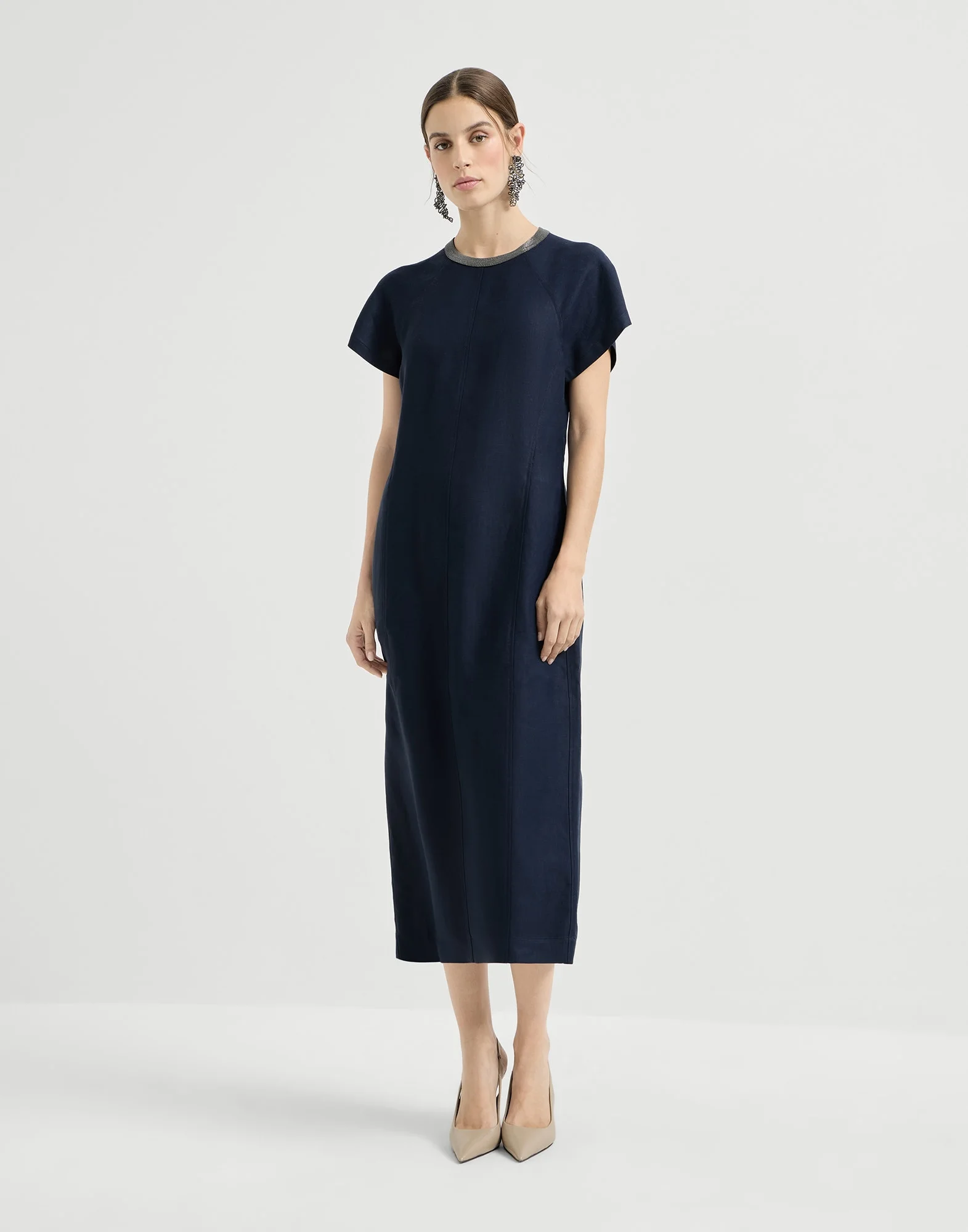 Precious details enrich the essential lines of this viscose and linen fluid twill dress. The light, flowing fabric naturally complements the feminine silhouette, enhanced by close-fitting proportions that develop into a skirt. An elegant shiny monili embroidery highlights the crew neck, adding a radiant sparkling note in true Brunello Cucinelli style. MATERIALS The blend of viscose and linen gives the twill a lightweight, very fluid appearance that is semi-crisp at the same time. DETAILS Collar with insert Concealed back zip closure Hand pockets Unlined Vent at bottom Nickel-free monili decoration 72% VISCOSE, 28% LINEN