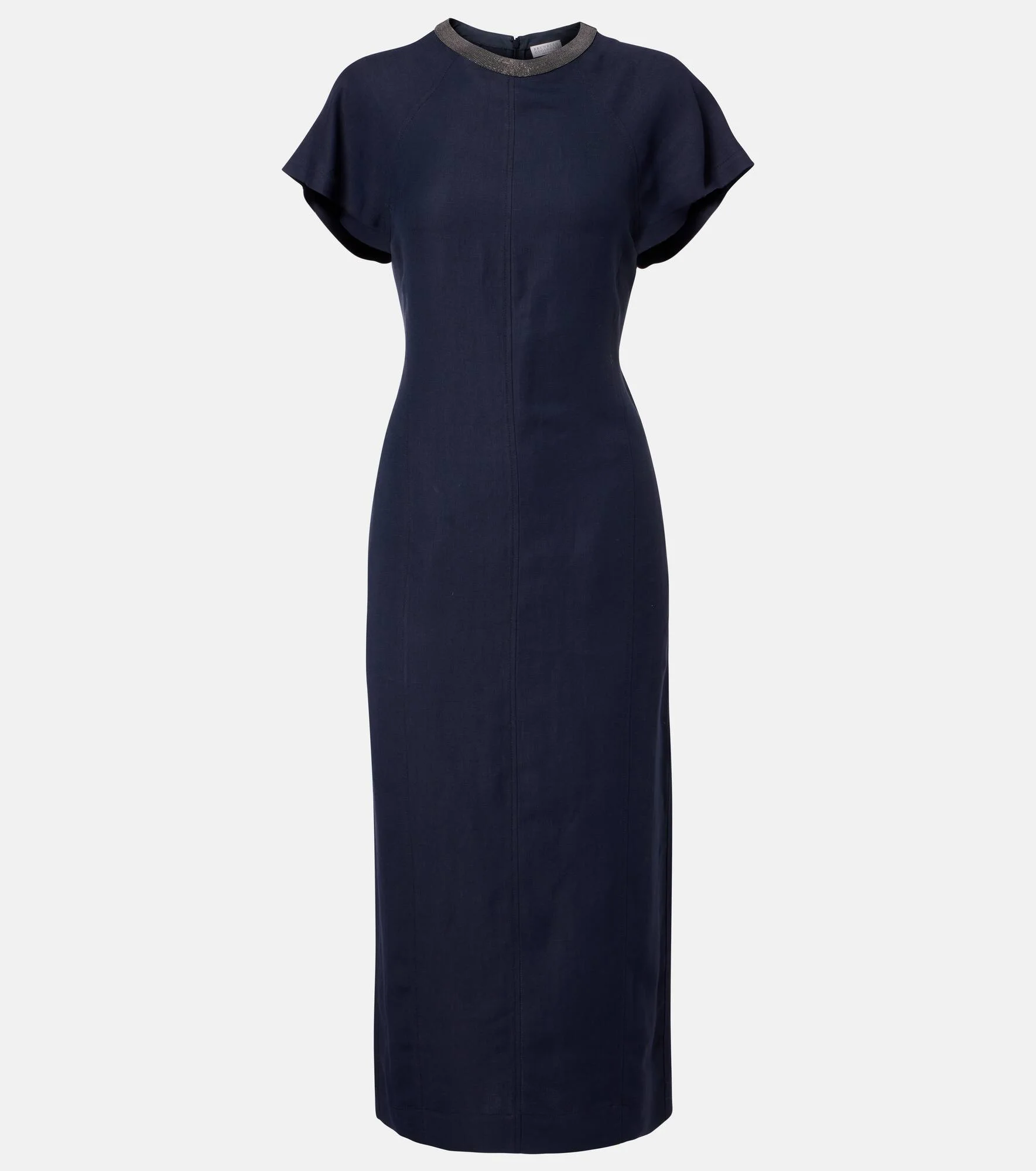 Brunello Cucinelli's Monili beading is made from nickel-free brass that's faceted to create a sparkling effect and hand-applied to each item. The signature embellishments adorn the crewneck of this short-sleeved midi dress. Product Details - Material: 72% viscose, 28% linen - Care instructions: dry clean - Made in Italy - Designer color name: Abyss - Item color: blue - Details: 100% brass - Material II: 74% acetate, 26% silk - Closure: concealed zipped back - Item number: P01143582 Size & Fit - True to size - Cinched waist - Non-stretchy fabric - slit length 38,0cm-15" - The model seen in the picture is 178cm-5'10" and wearing a size XS