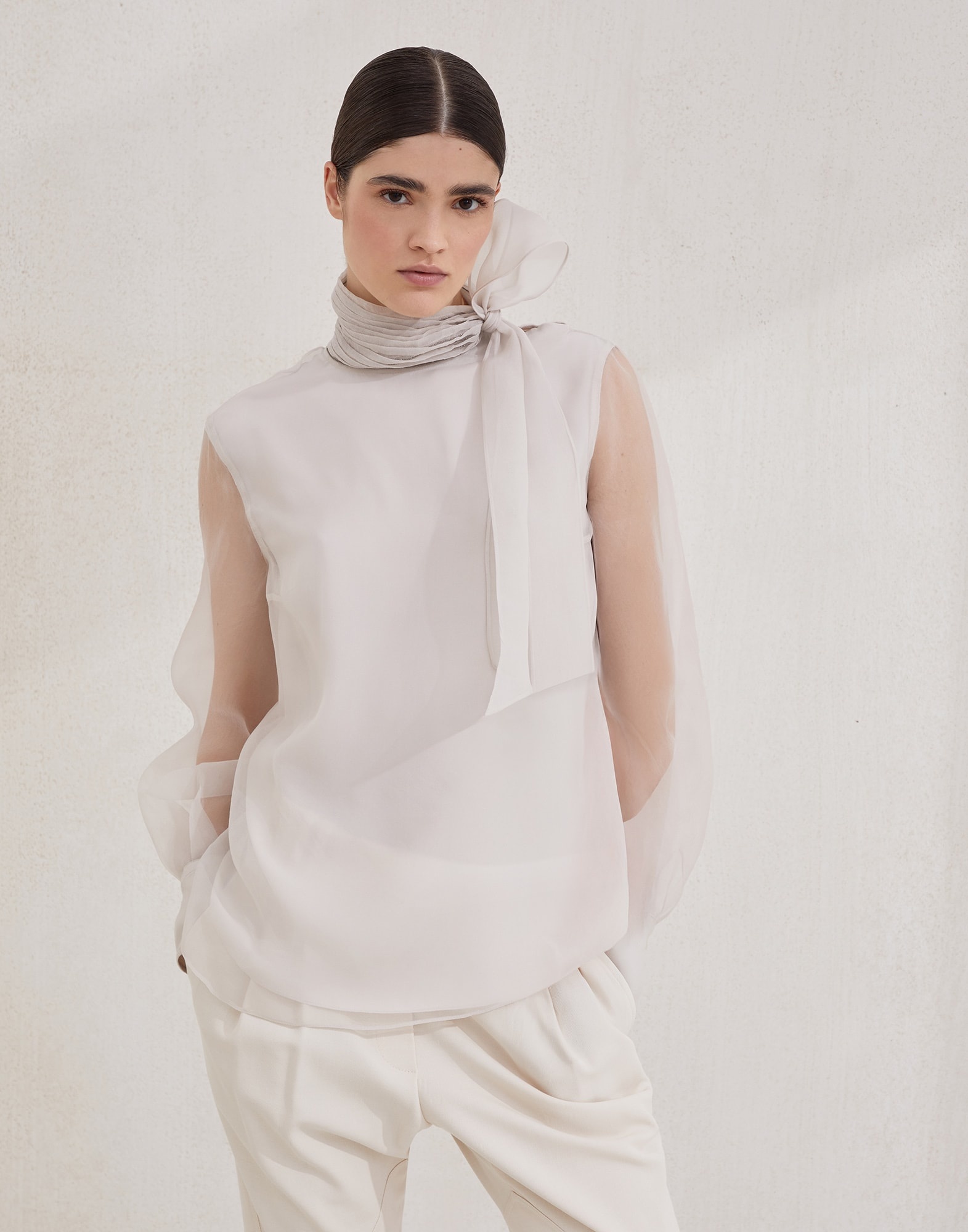 Precious, feminine details come together in this new pussybow blouse in crispy silk. The lightweight, fluid fabric complements the garment’s straight, essential lines, while the pussybow, delicately knotted on one side, adds a note of refined elegance. A fine monili embroidery completes the blouse with a distinctive sparkling note in true Brunello Cucinelli style. MATERIALS Refined Crispy silk is an ultra fine fabric characterized by a transparent, matte look. The fabric’s delicate color stems from a particular dye that preserves the fiber’s natural textured effect. DETAILS Self-tie band Cuffs have one mother of pearl button Silk-blend crepe lining Nickel-free monili decoration 100% SILK