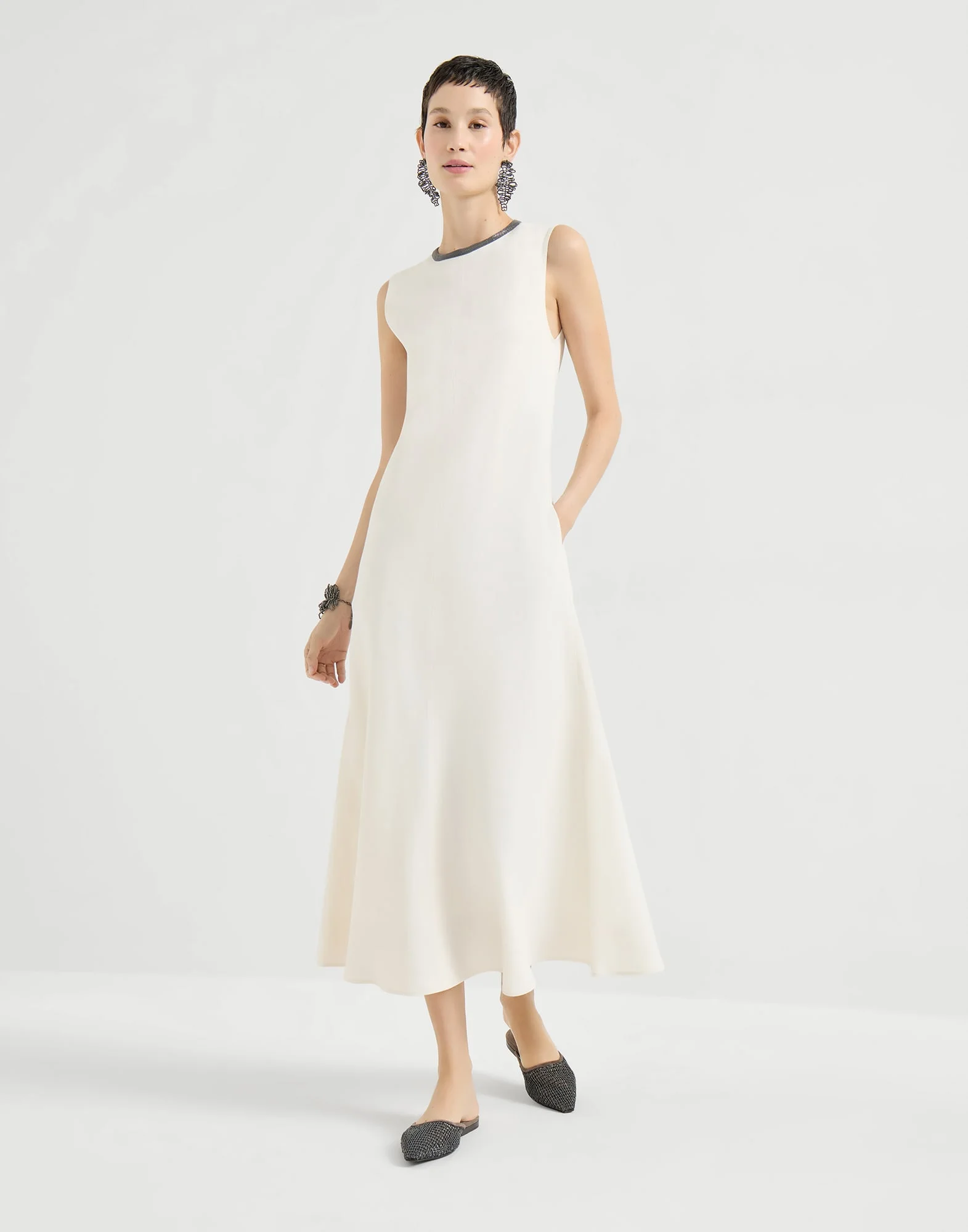 Precious details enrich the essential lines of this viscose and linen fluid twill dress. The light, flowing fabric naturally complements the feminine silhouette, enhanced by the close-fitting design that flares slightly at the bottom. An elegant shiny monili embroidery highlights the crew neck, adding a radiant sparkling note in true Brunello Cucinelli style. MATERIALS The blend of viscose and linen gives the twill a lightweight, very fluid appearance that is semi-crisp at the same time. DETAILS Collar with insert Concealed back zip closure Hand pockets Cupro lining Nickel-free monili decoration 72% VISCOSE, 28% LINEN