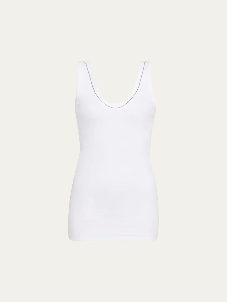 Brunello Cucinelli flat cotton rib tank top featuring monili embellished neckline Scoop neckline Sleeveless Fitted Pullover style Cotton Made in Italy