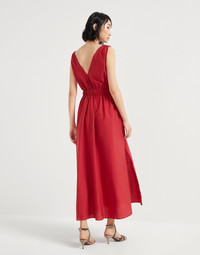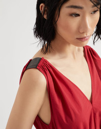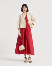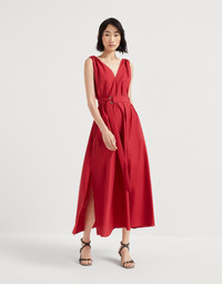 The combination of casual materials, feminine lines and precious details defines the style of this new techno cotton poplin dress. The season’s colors highlight the fabric’s light texture, while the adjustable waist belt enhances the garment’s wide, fluid silhouette. A sparkling monili embroidery illuminates the shoulders with a particularly elegant note. MATERIALS Lightweight techno cotton poplin is a classic fabric of the Brunello Cucinelli collections. The presence of synthetic fiber helps to preserve the texture’s slightly irregular effect. An unlined construction promotes the fabric’s lightweight and fluid traits. DETAILS V-neck Attached ring belt Nickel-free monili decoration 75% COTTON, 25% NYLON
