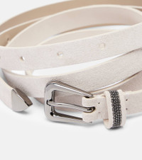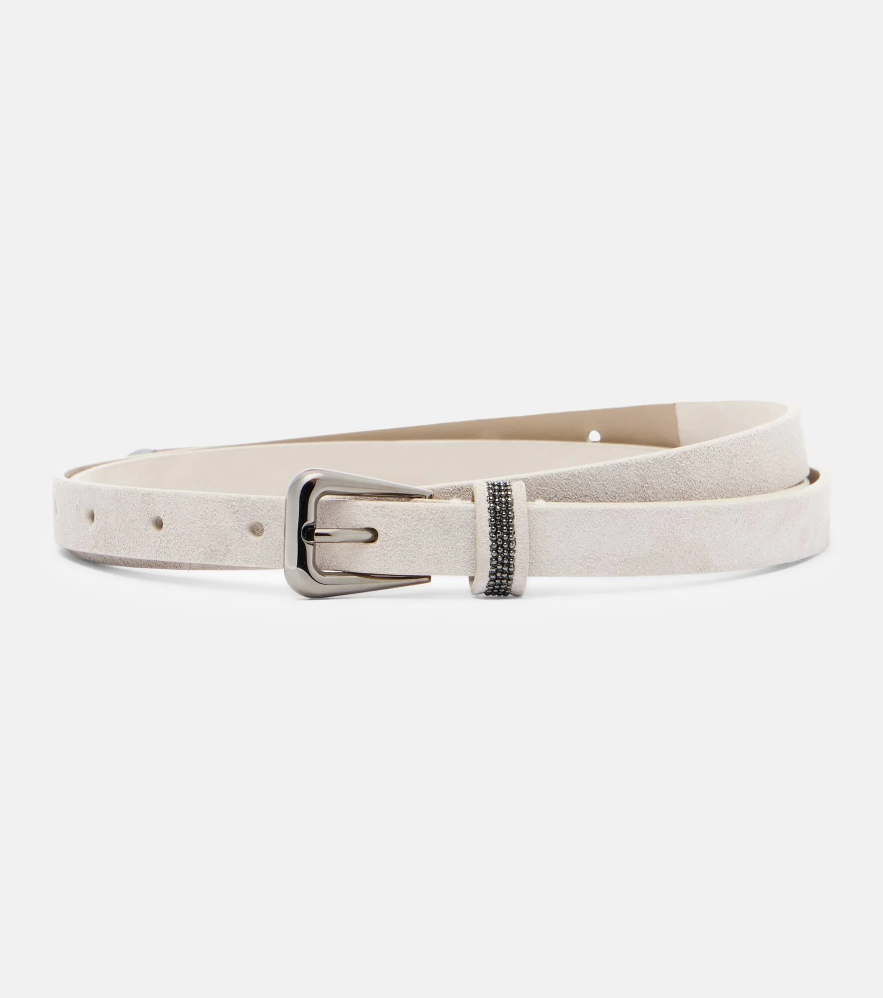 Brunello Cucinelli's designs are created in Solomeo, a medieval hamlet whose art and traditions are woven into the house's every fiber. This belt is crafted from supple suede with the brand's signature Monili bead detailing and a sculptural, silver-toned buckle. Product Details - Material: leather (suede) - Lining: leather - Made in Italy - Color: white - Designer color name: Bone - Includes: dust bag, box - Item number: P01131700 Size & Fit - Width 1,5cm-0.5" - Buckle width 2,5cm-1" - Length of size XS = %cm%cm-%inch%" - Length of size S = %cm%cm-%inch%" - Length of size M = 74/102cm-29/40" - Length of size L = %cm%cm-%inch%"