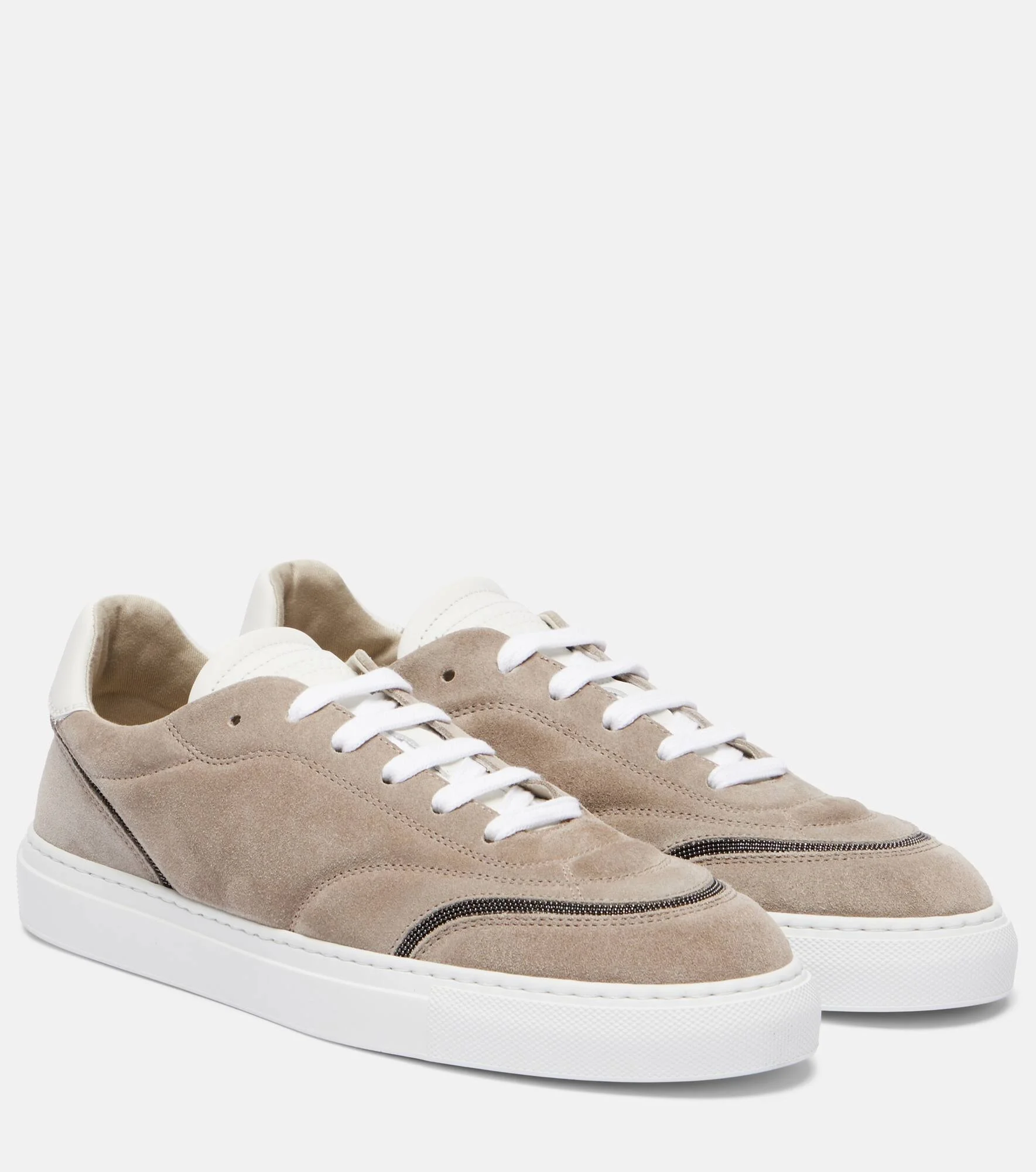 Monili beading is made from nickel-free brass that's faceted to create a sparkling effect and hand-applied to each item. These Brunello Cucinelli sneakers are crafted from buttery suede and feature the signature embellishments at the trims and contrasting laces. Product Details - Upper: leather (suede) - Lining: fabric - Sole: fabric insole, rubber sole - Toe shape: almond toe - Made in Italy - Includes: shoe box, dust bags - Designer color name: Roccia - Item color: brown - Item number: P01064444 Size & Fit - Fits large to size - we recommend trying one size smaller - European sizes - 3cm-1" platform (size EU 38)